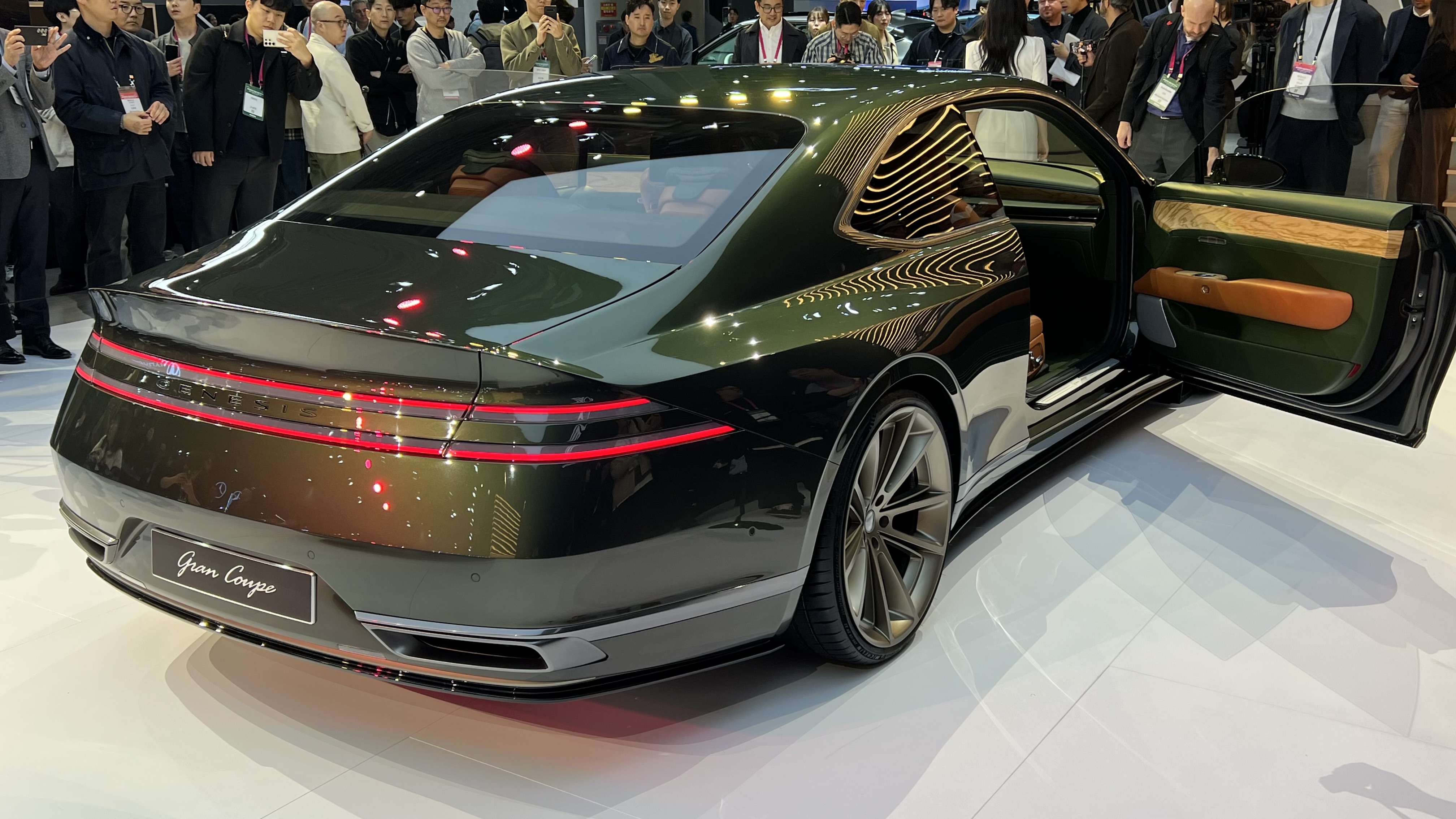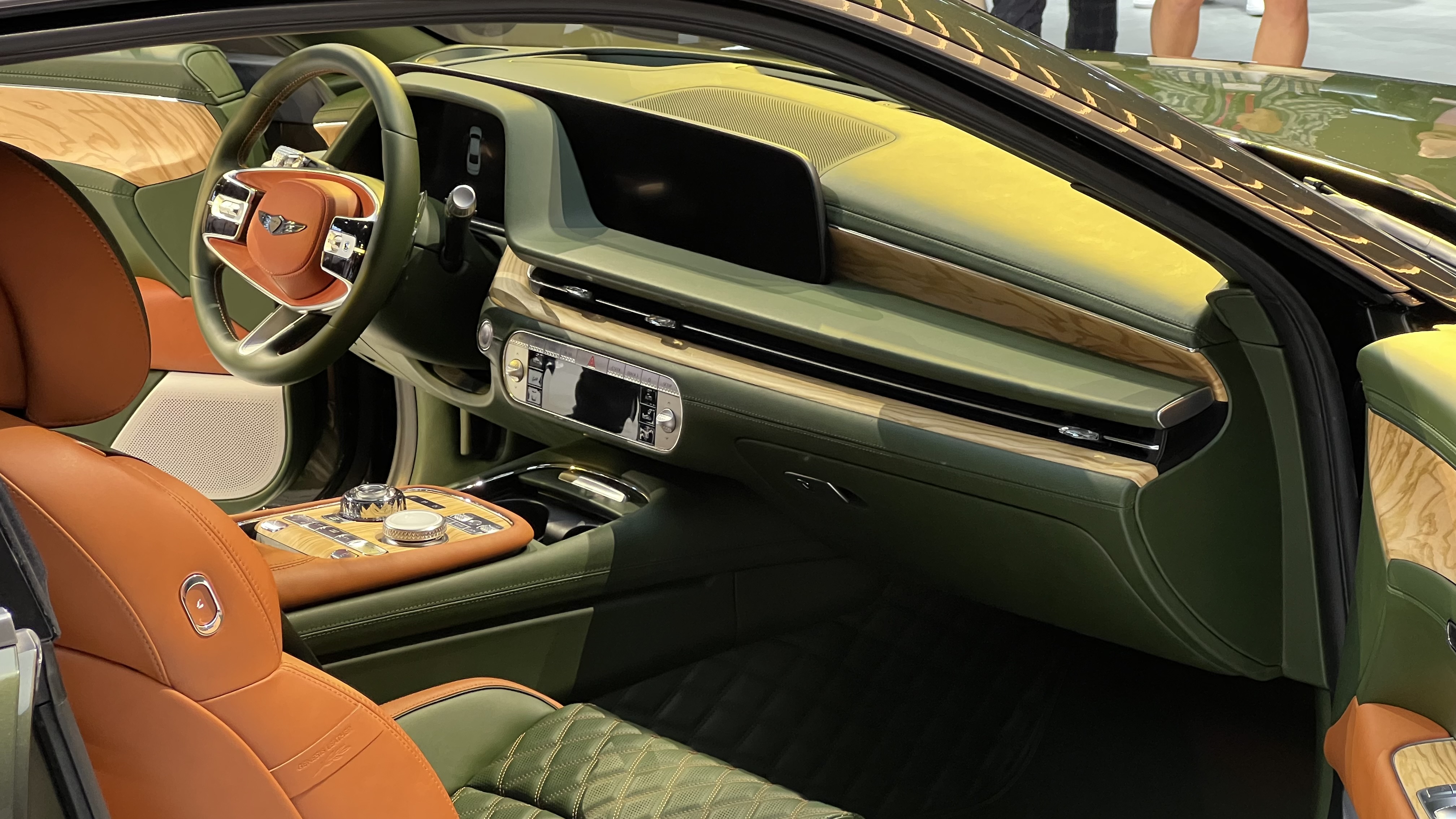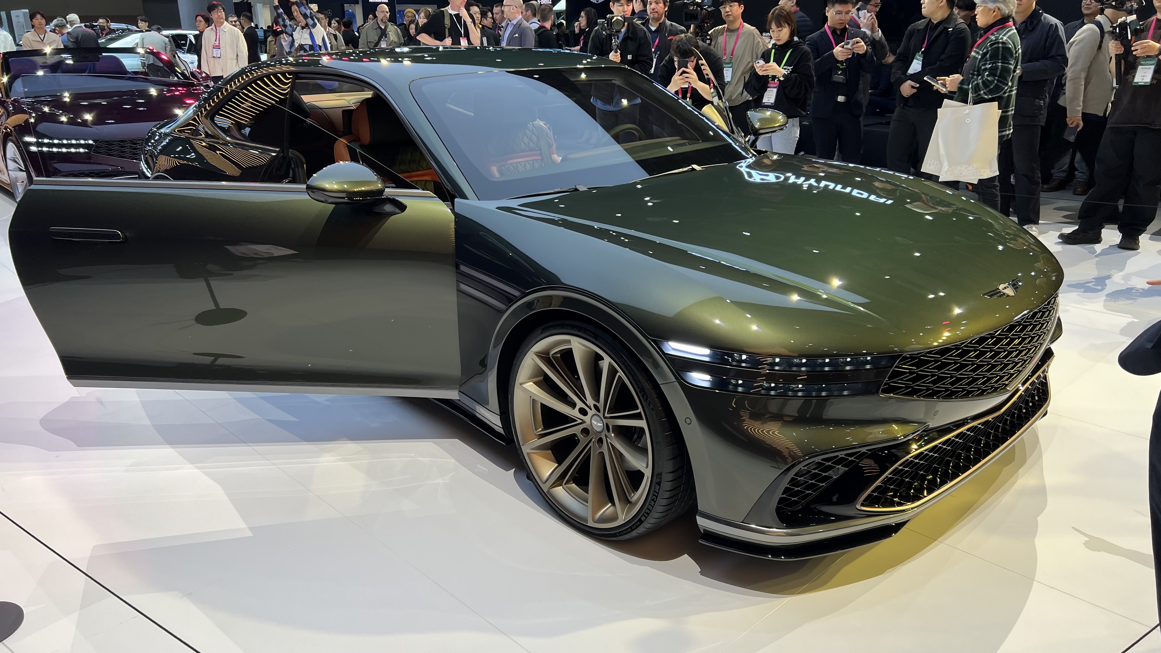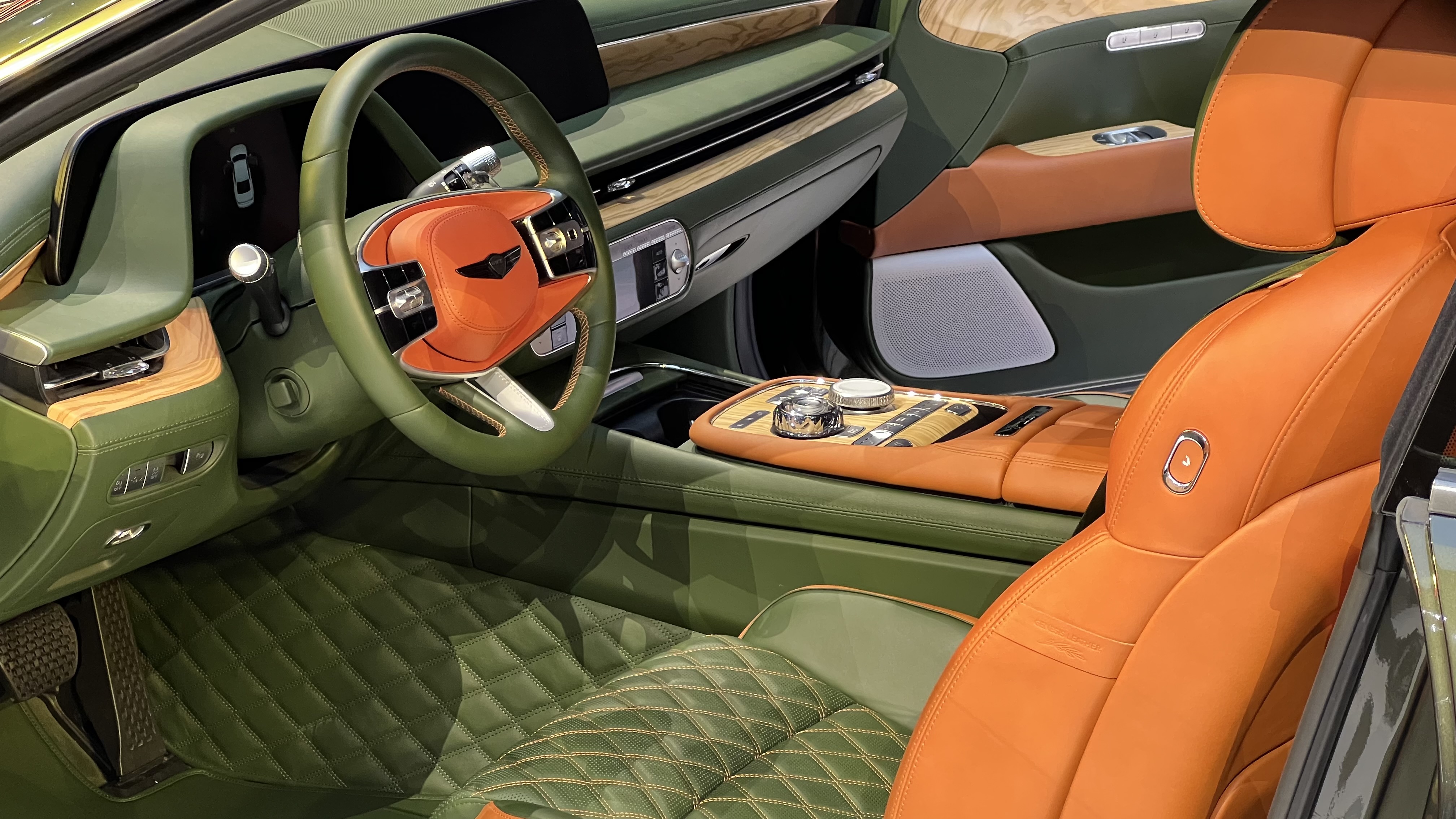 Looking at the decidedly showroom-ready interiors, we’d honestly be shocked if a pair of flagship grand-touring Genesis vehicles don’t make production at some point. There are buttons and knobs, and parts lifted straight out of current Genesis production models. No powertrain or engineering details have been revealed in writing, but we can spot a tachometer, a button to disable auto start-stop, and shift paddles behind the steering wheel made of crystal. In other words, these things burn gas.