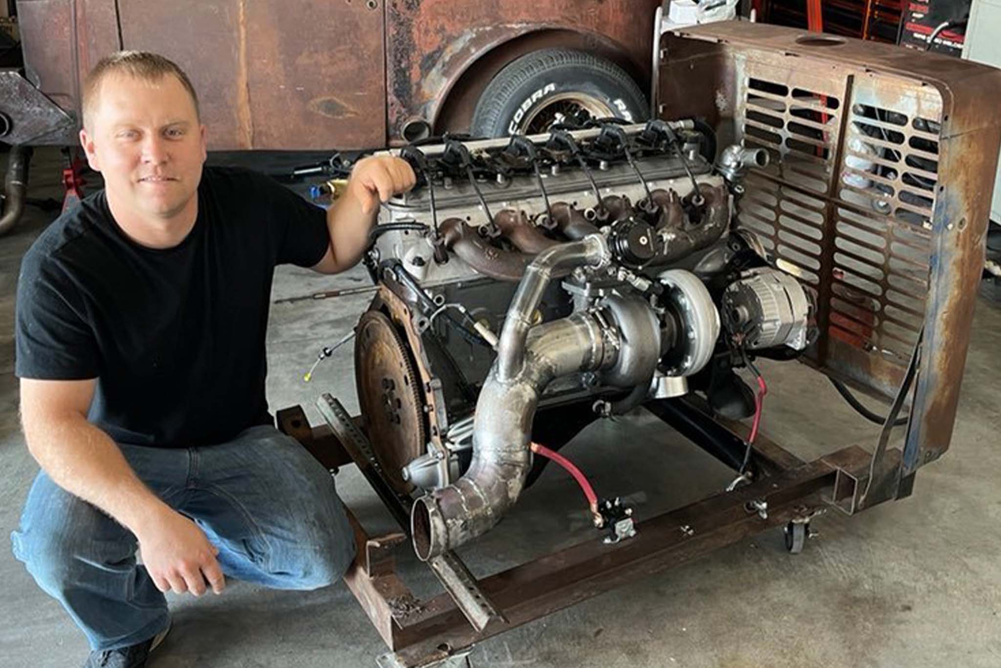 Eventually, it’ll go in his rat rod that’s titled as a 1935 Chevy. It has a “hodgepodge” of other parts, including a top-loader four-speed transmission and a Ford 8.8-inch rear-end.