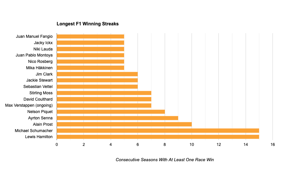 Still, with another eight wins under his belt, that brought Hamilton to 15 straight winning seasons, tying the all-time record of Michael Schumacher. Note, however, that Schumacher’s record is slightly sullied by a championship disqualification for… Well, driving like an absolute dick.