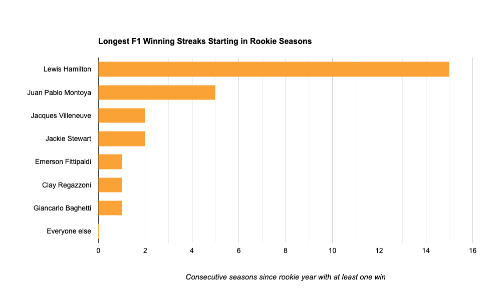 During his rookie year, Hamilton became one of only seven drivers in F1 history to win a race in their first season. (That’s excluding the Indy 500, where F1 raced ’til 1960, and the winners of the 1950 season who were already veteran Grand Prix racers.) Every single one of those rookie winners is a statistical anomaly in their own right, and most of them are drivers you’ve heard of. But even among F1 nobility, Hamilton’s record stands almost on its own.