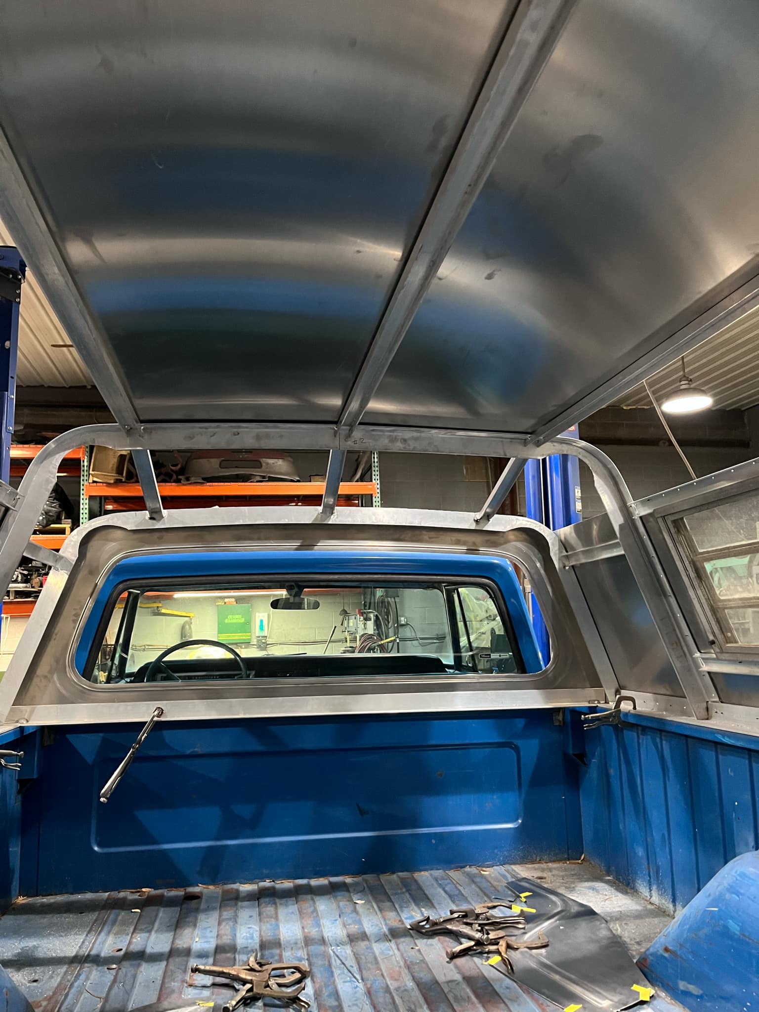 Pitcher started his build completely from scratch with four pieces of 2-inch angle iron that’s 1/8-inch-thick, two pieces of 1.5-inch C-channel, two pieces of 2- by 3-inch angle iron that’s 1/4-inch-thick, a piece of bar stock, and a scrap plate. These materials make up the framing, which Pitcher bent and shaped himself after determining the exact form he wanted it to take. The plan is to run it on his 1969 Dodge D200 Camper Special with a big block, though it’ll also fit his first-gen Cummins. Since both trucks have a slight arch to their roofs, he made the bed cap with a pitched top that raises a foot or two behind the cab.