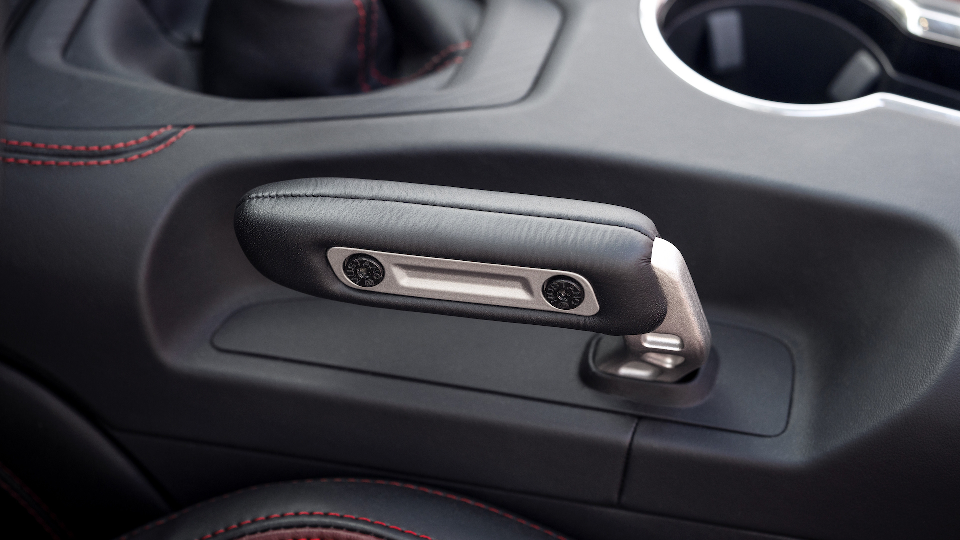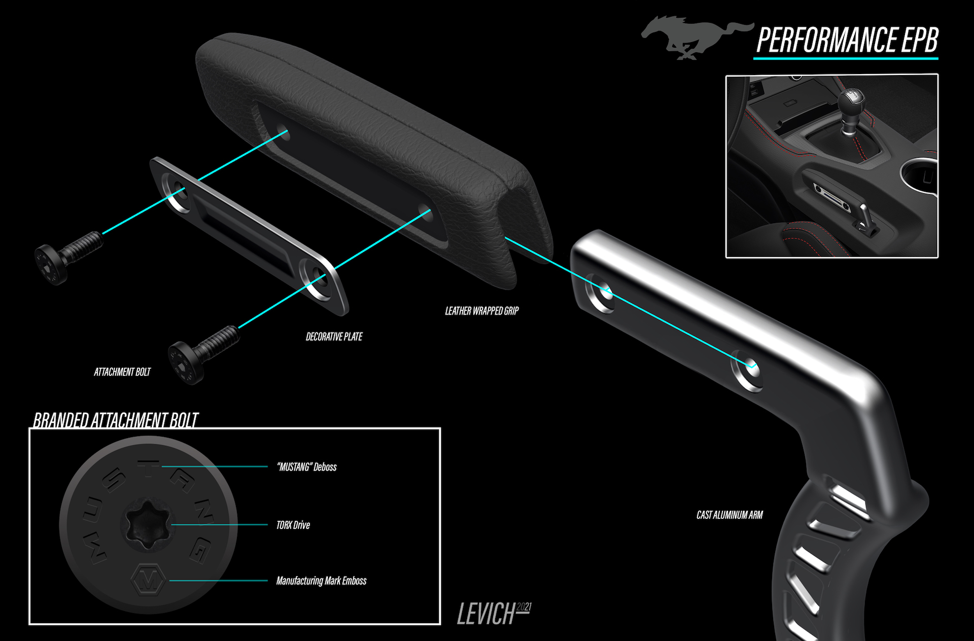 For those who would like to personalize their Drift Brake, Ford says aftermarket EDB handles can be swapped in. As a small easter egg, the little bolts on the side of the factory handle say “Mustang” on them.