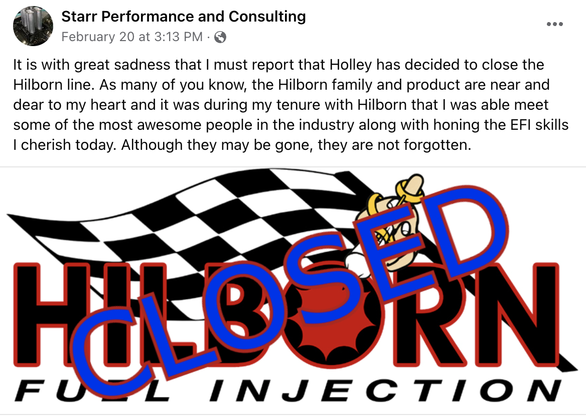 “It is with great sadness that I must report that Holley has decided to close the Hilborn line,” Starr Performance and Consulting shared on Facebook.