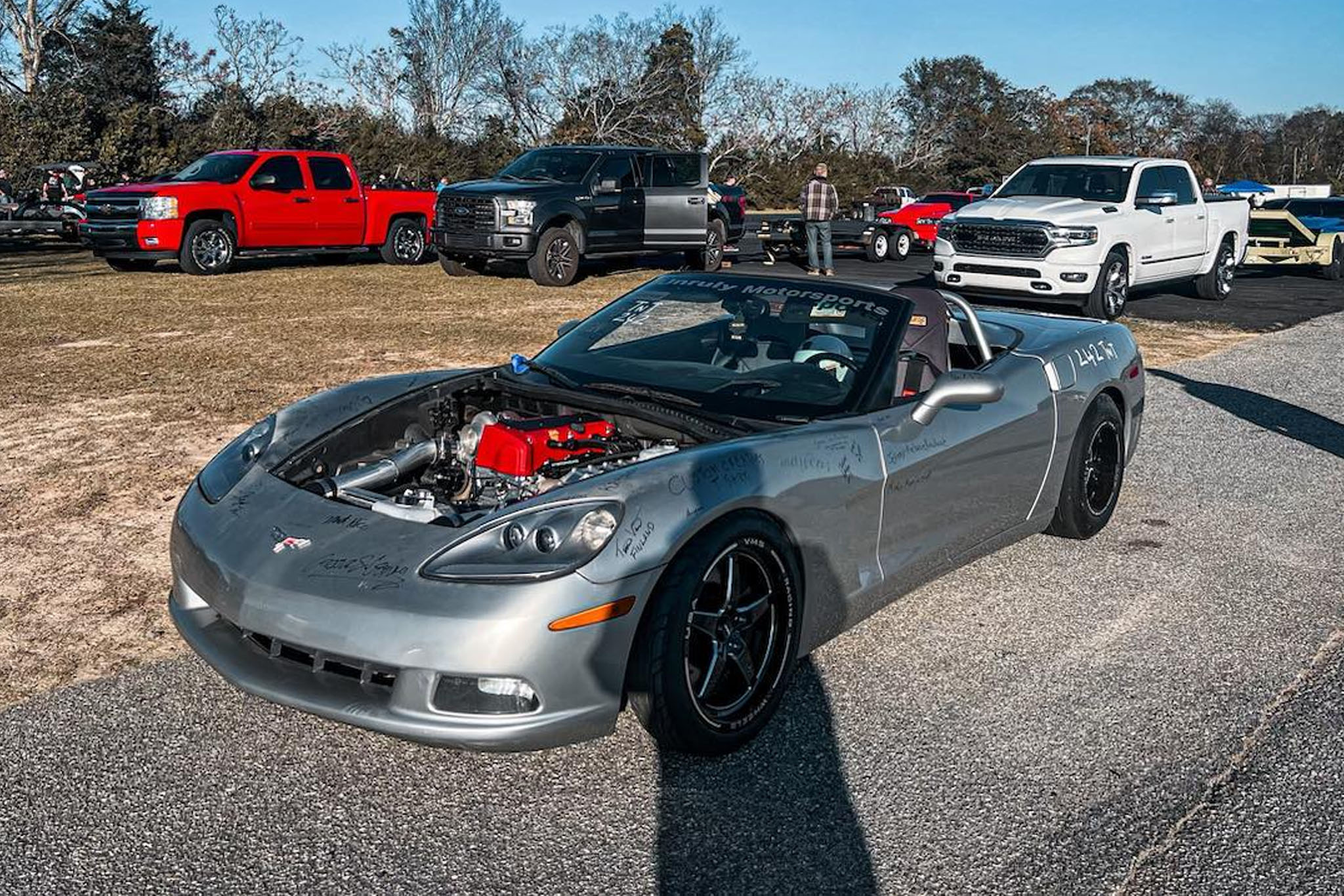 If you’re curious about what a mostly un-tuned K-swapped Corvette sounds like doing a burnout, that’s below. I thought it might seem strange to see a Corvette doing a burnout without a small-block Chevy soundtrack, but it isn’t. It is unusual to see V8-swapped Miatas attempting similar feats, though. Audio always seemed dubbed-in to me.