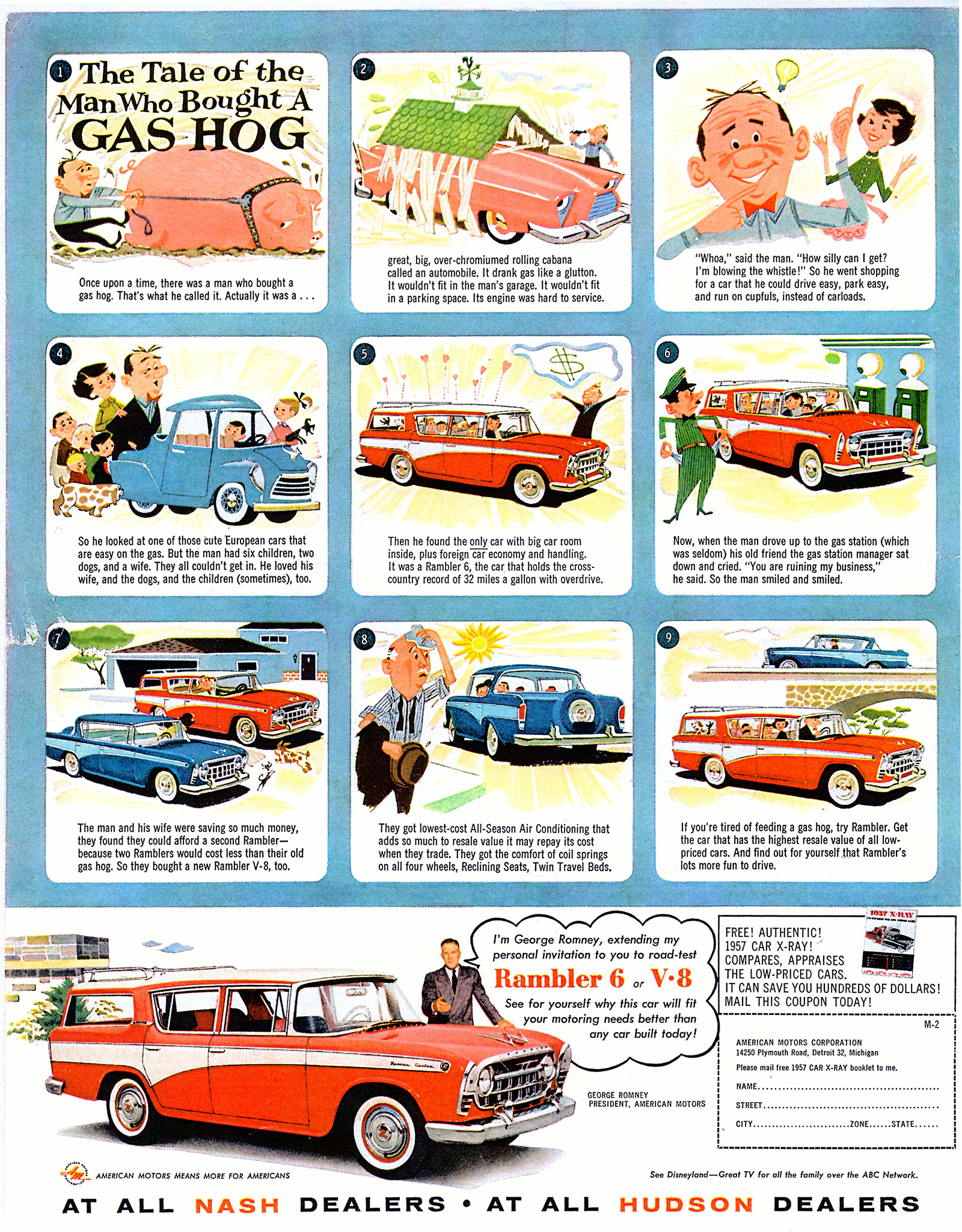 Romney traveled tens of thousands of miles to give more speeches, still railing against “gas guzzling dinosaurs,” and carrying a handful of tiny ceramic dinos with him for dramatic effect. Nash and American Motors had long marketed their cars to women, and with a growing number of two-car families and women drivers, he often spoke to economically-minded homemakers around the country.