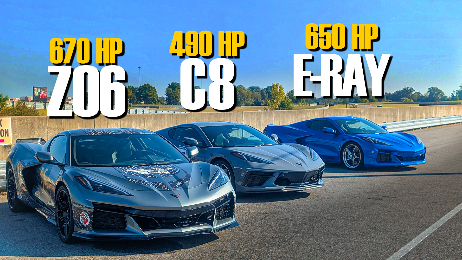 Of course, there are numerous changes between the trims beyond horsepower: the E-Ray is an all-wheel-drive hybrid, and the Z06 comes with a bunch of extra performance parts. But power is the headline number for many with these cars, and that’s what we’re focusing on. So can a regular Joe really tell the difference? Watch and enjoy.