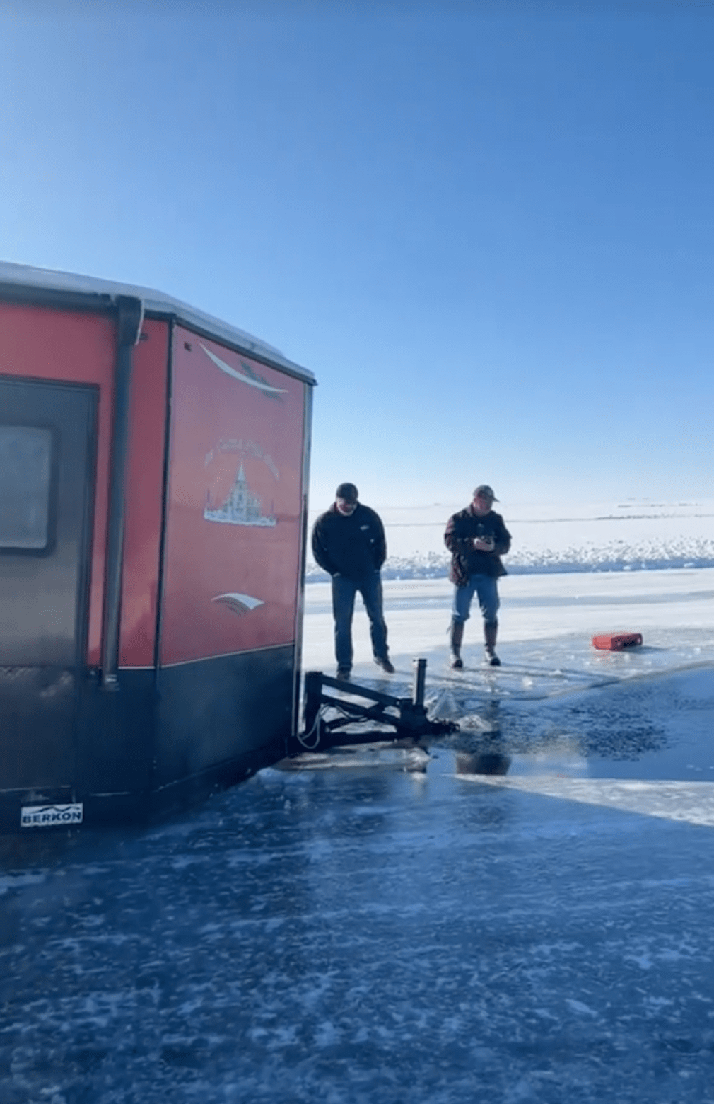“We had five, six seconds to bail out or we would have been at the bottom of the lake with it,” Brown explained. “The truck hit the bottom and pivoted straight up and down. It was still hooked to the ice house.”