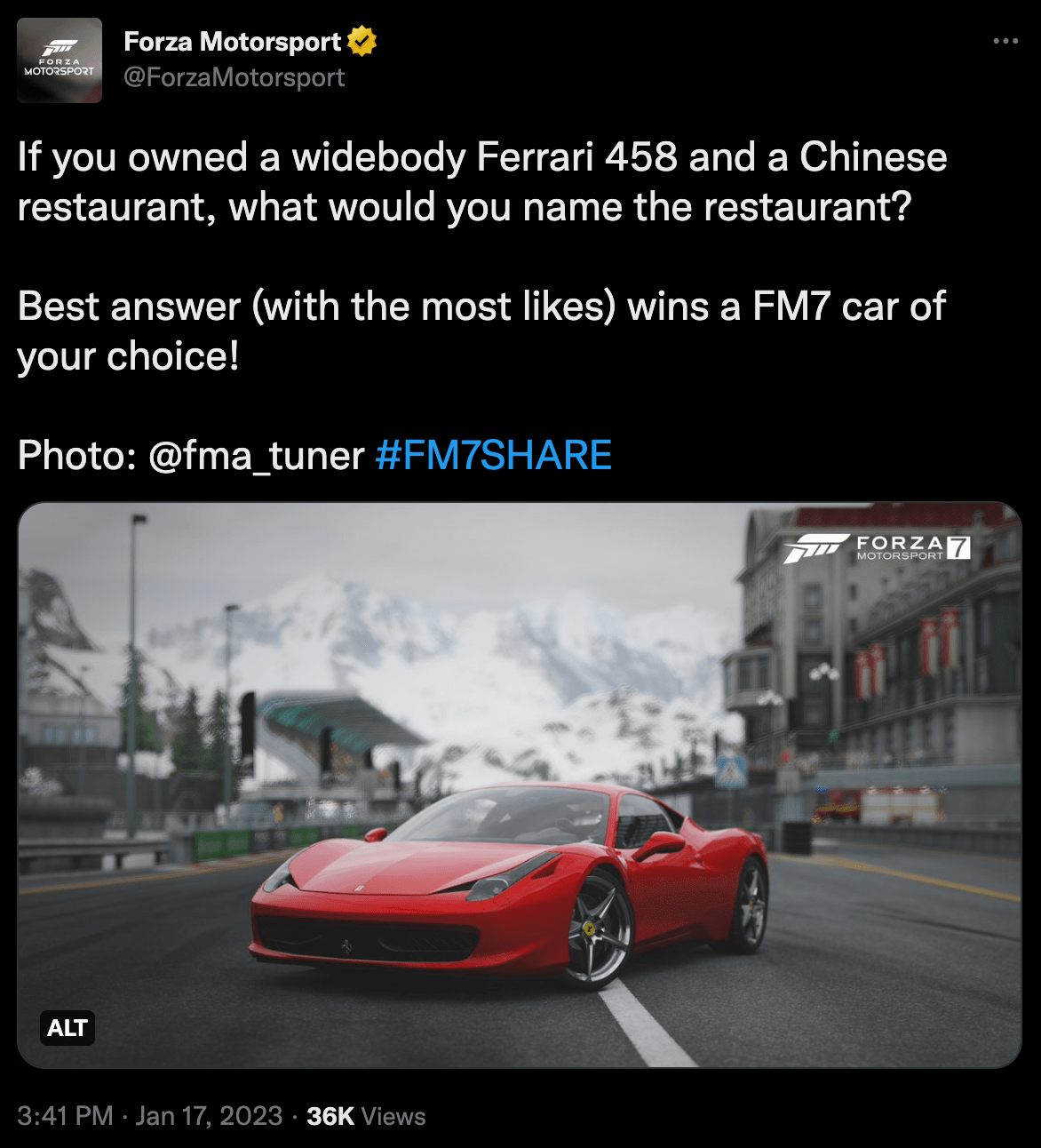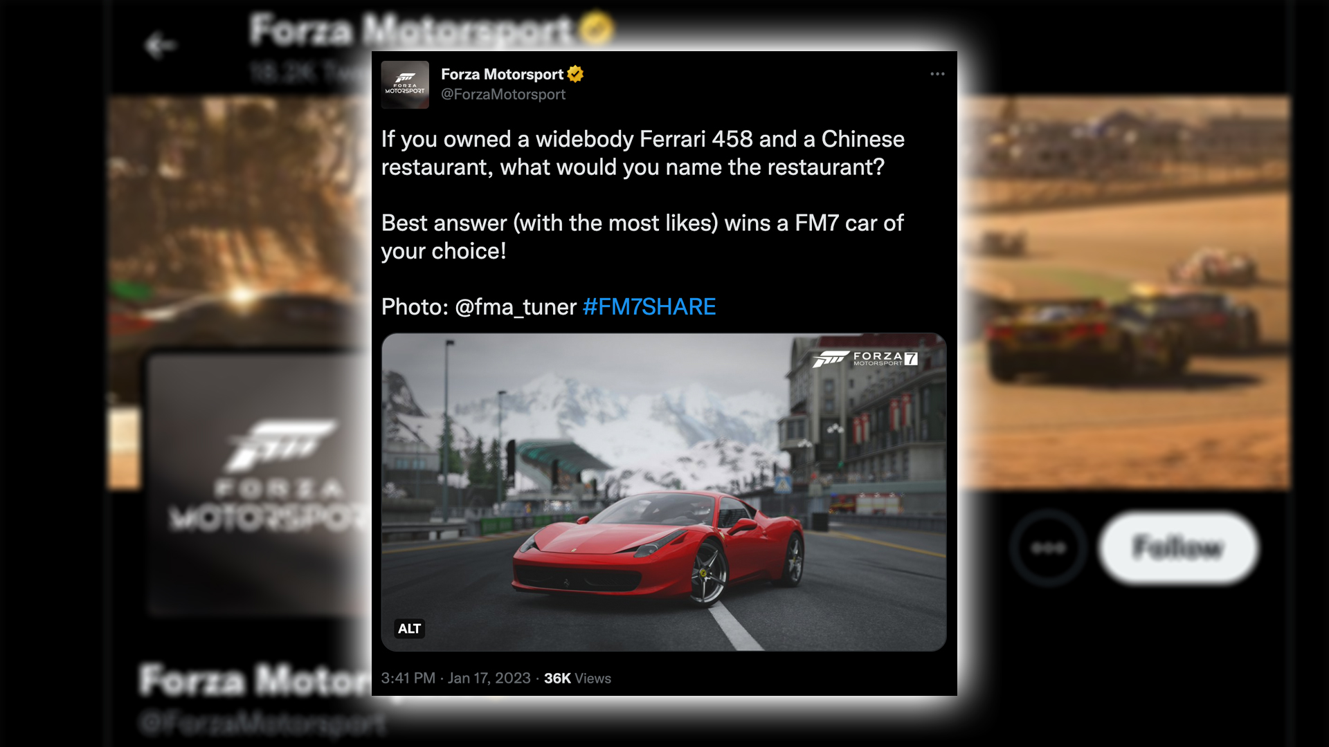 “If you owned a widebody Ferrari 458 and a Chinese restaurant,” the tweet asked, “what would you name the restaurant?” It went on to say that the user with the best answer would be rewarded with an in-game car of their choosing.