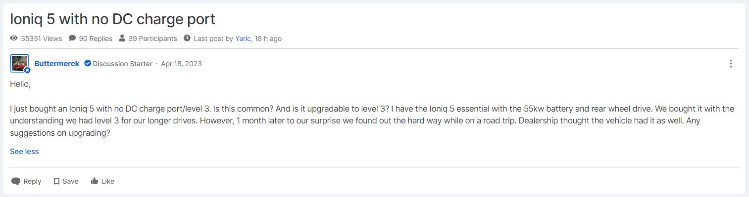 Poster Buttermerck introduced themselves on a Hyundai Ioniq forum asking it if was possible to upgrade their vehicle to accept a Level 3 charger. Almost instantly, they were met with skepticism by owners who simply thought that the vehicle had a cap on the CCS connector that hadn’t been removed, or that they tried to charge with the wrong charging standard. After investigating further and realizing that the actual harness for DC fast charging wasn’t installed, other owners were surprised and thought that the car was improperly assembled at the factory.