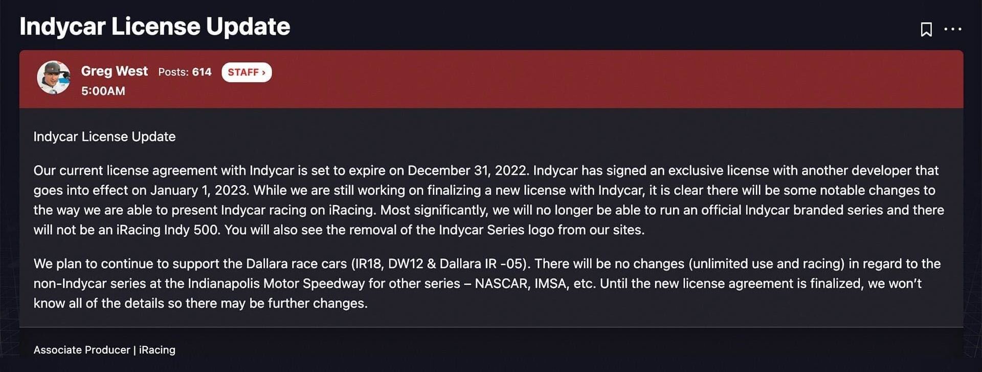 West stated that iRacing will remove the IndyCar logo from its websites and terminate its official IndyCar branded series. That also means no more iRacing Indy 500, reportedly been the biggest event in sim racing for years now. According to Racer, iRacing’s open-wheel league schedule has been altered to remove tracks where IndyCar races, instead substituting circuits where the cars don’t race in real life.