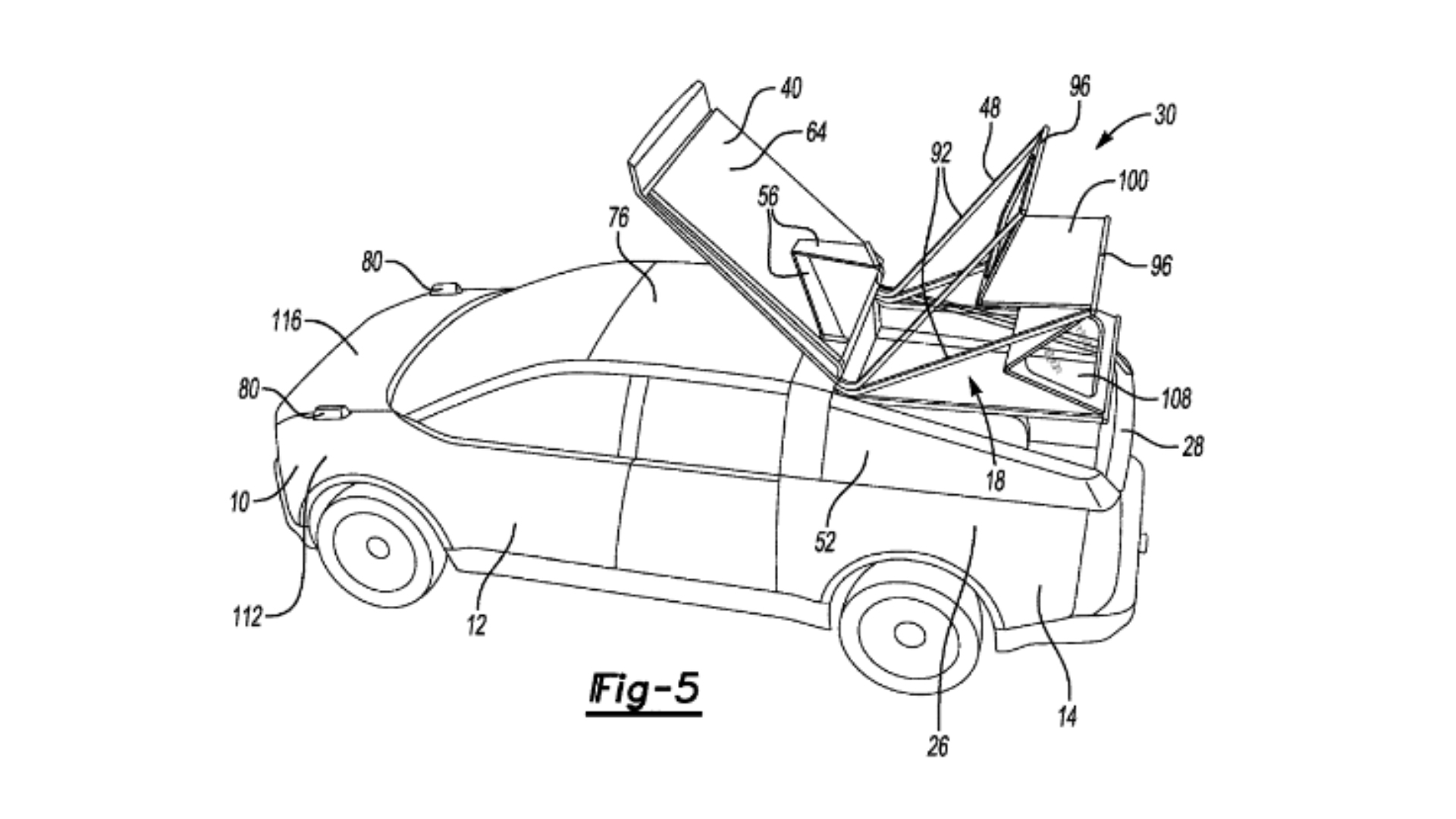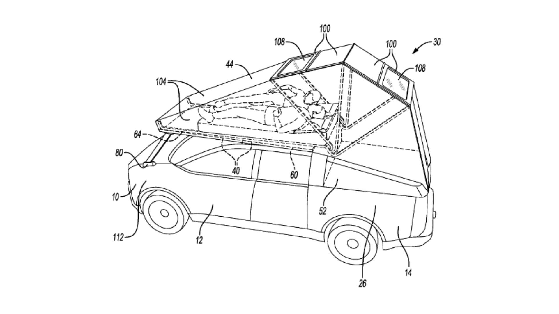 The application itself is for a deployable roof tent, but as clever as it appears, we’re far more interested in the trucklet they’ve hypothetically installed it on, because, well, just look at it. The built-in latch system leveraged here would be right at home on one of Ford’s compact truck or SUV offerings, but this design looks nothing like the Maverick. Instead, it’s much more… uh… Cyber-trucky?