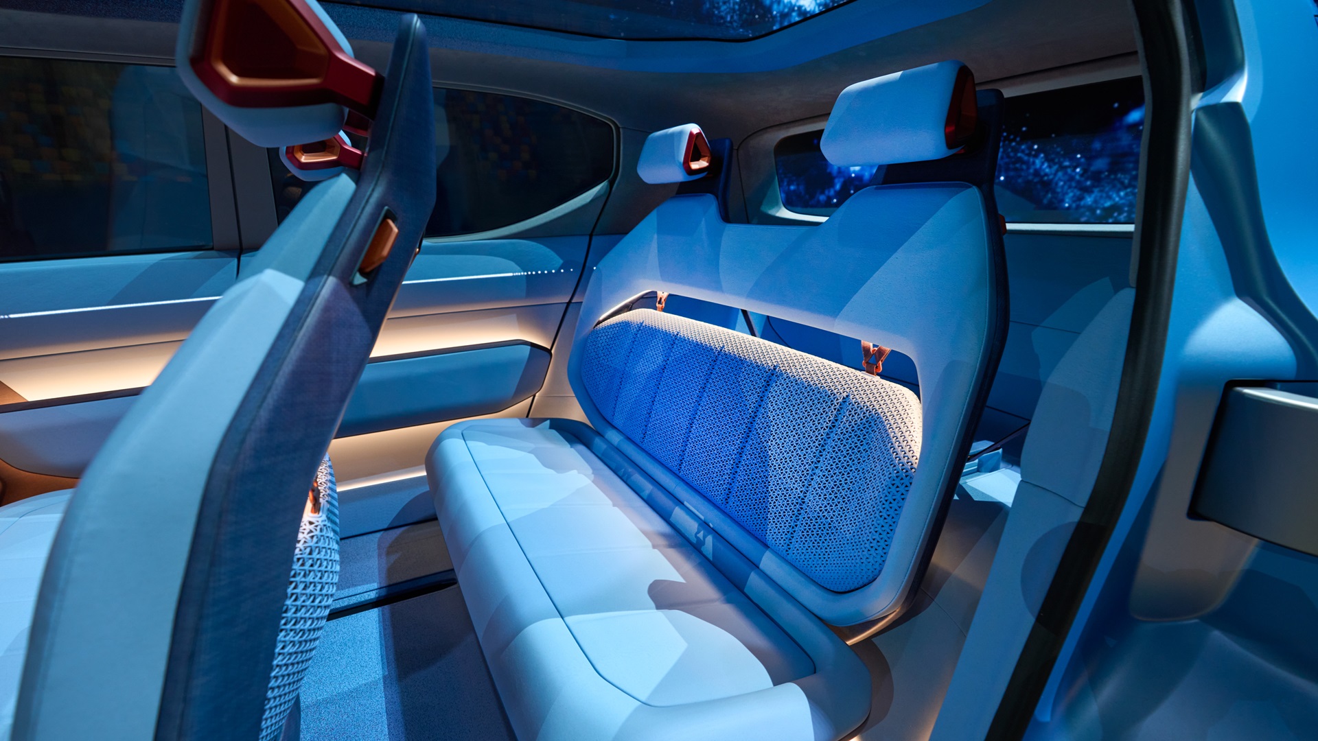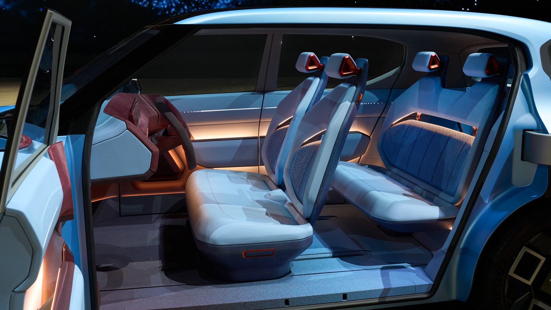 The rear-hinged doors are neat, but they’re unlikely to make the leap from the auto show floor to the showroom floor. Speaking of floors, Kia notes that the electric architecture allowed its designers to give the EV2 a totally flat floor and a modular interior. The rear seat cushions flip up to allow the front passengers to slide their seats all the way back and relax. Kia also fitted removable door speakers so that you can take the party outside, and the occupants can display text messages through the windows (seriously) to communicate with pedestrians and other road users.