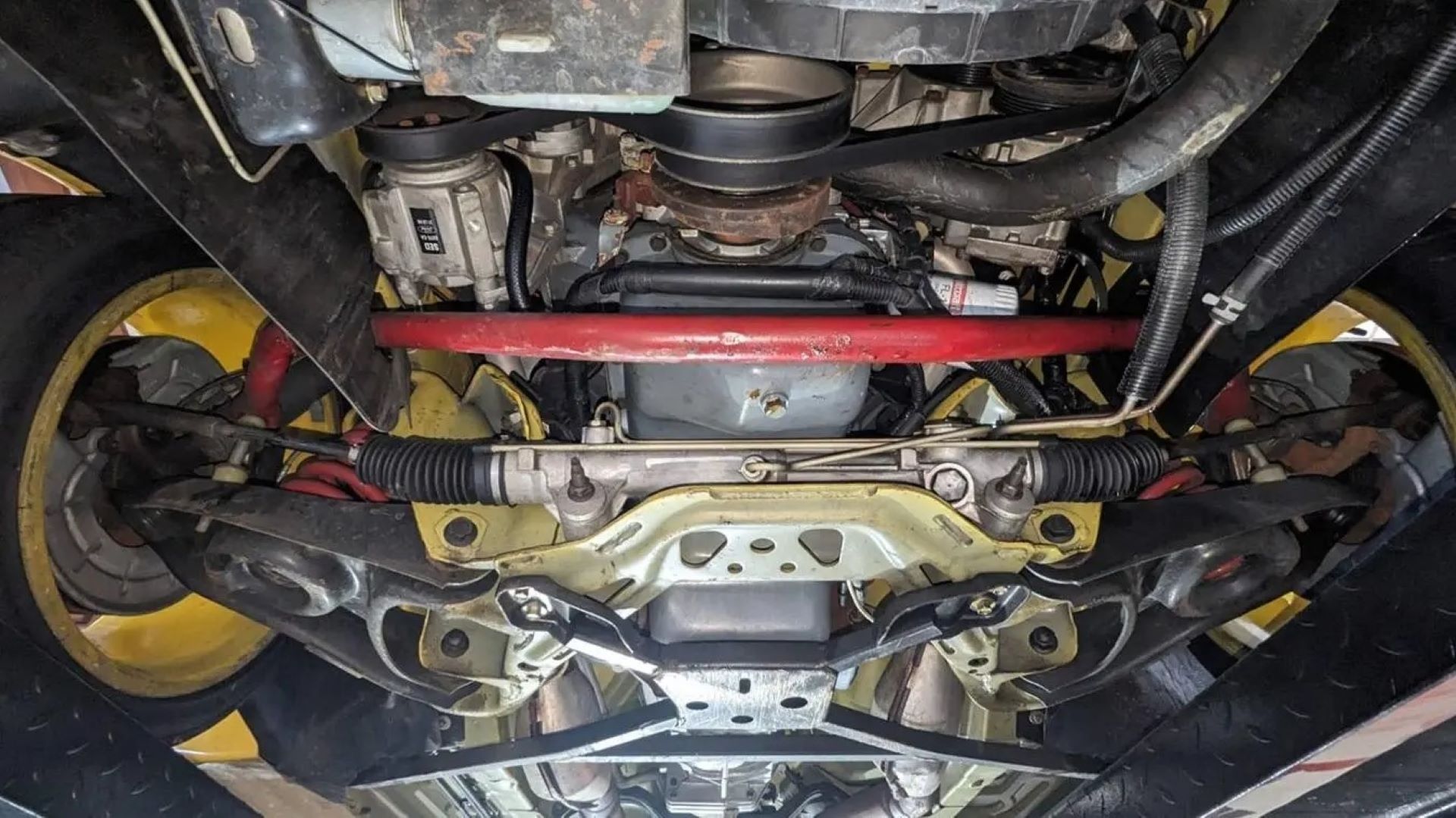 The listing states there are 227 miles on the odometer, which was replaced in 1996 when it read 505 miles. There was no reason given for the replacement but the change is documented on the door jamb. The seller also clarified the appearance of discoloration within the engine bay and undercarriage, especially for such a low-mileage car.