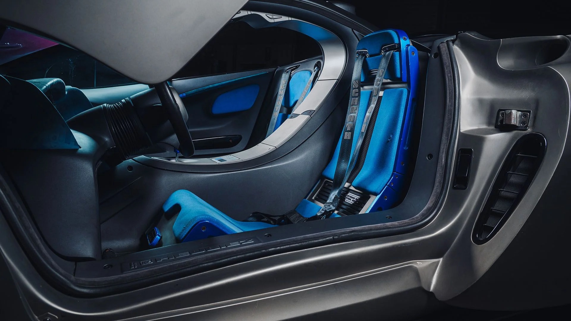For the Pregunta, Lamborghini turned to French coachbuilder Carrosserie Heuliez and, specifically, designer Marc Deschamps, to reshape the Diablo in the image of a Dassault fighter jet, built from carbon fiber. If the exterior was futuristic, with its soft and clean, yet amorphous presence, then the interior was otherworldly. I love a blue cabin, but the pattern of the dash looks like the upholstery of a Greyhound bus from Neptune. Apparently, that’s the display for a rearview camera just under the windshield there; how far we’ve come.