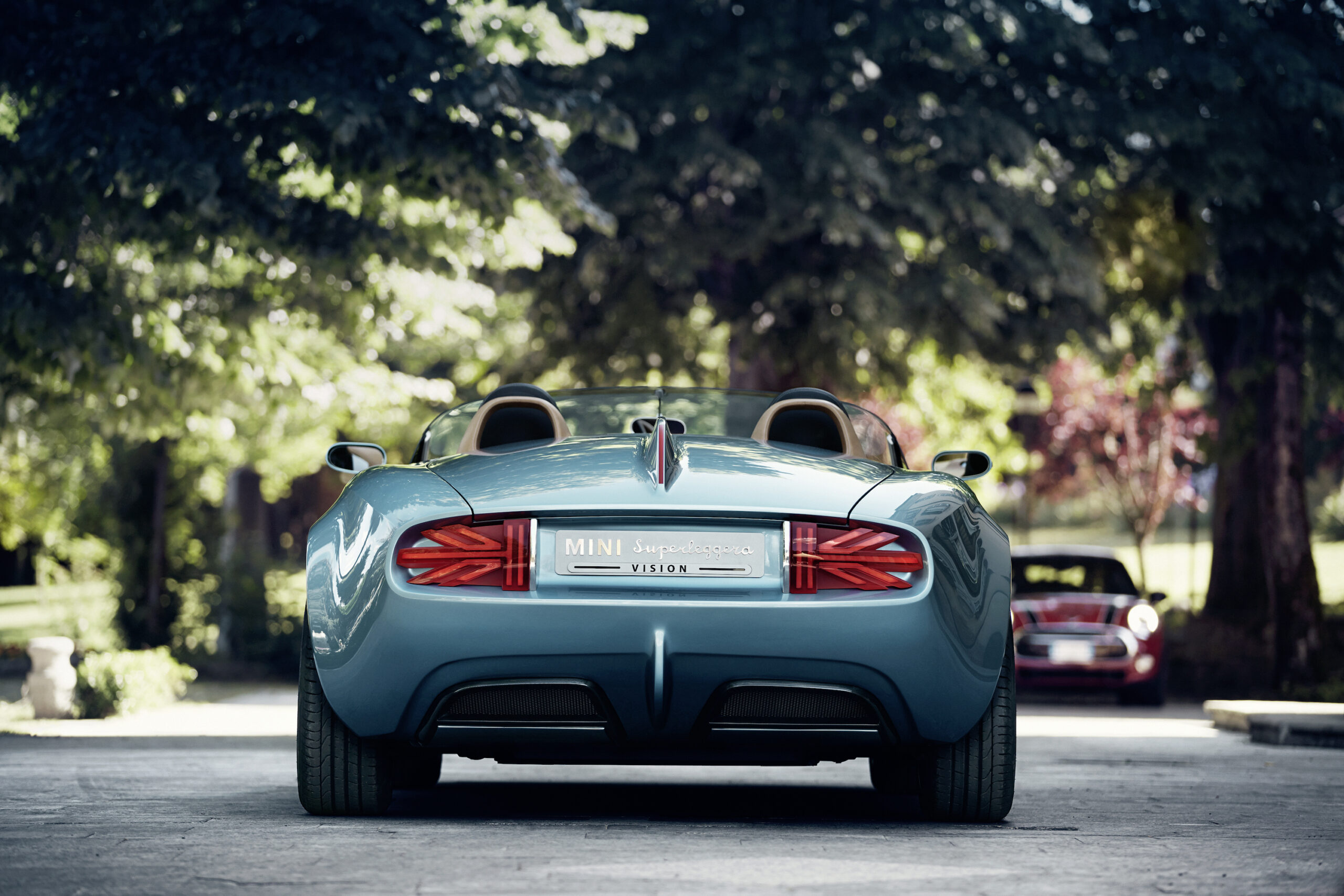 Finished in a color called Como Blue, the Superleggera Vision looks as though it was made from liquid sheet metal poured from a prosecco glass. It still wears the distinctive Mini face and pushed-out wheels with small overhangs, but the smooth shape of the doors and the frameless windscreen give it distinctive flying saucer vibes. A raised, central fin runs down the car’s spine and ends at the rear with Union Jack-shaped taillights. These I’m still not 100 percent sold on, but it is a Mini.