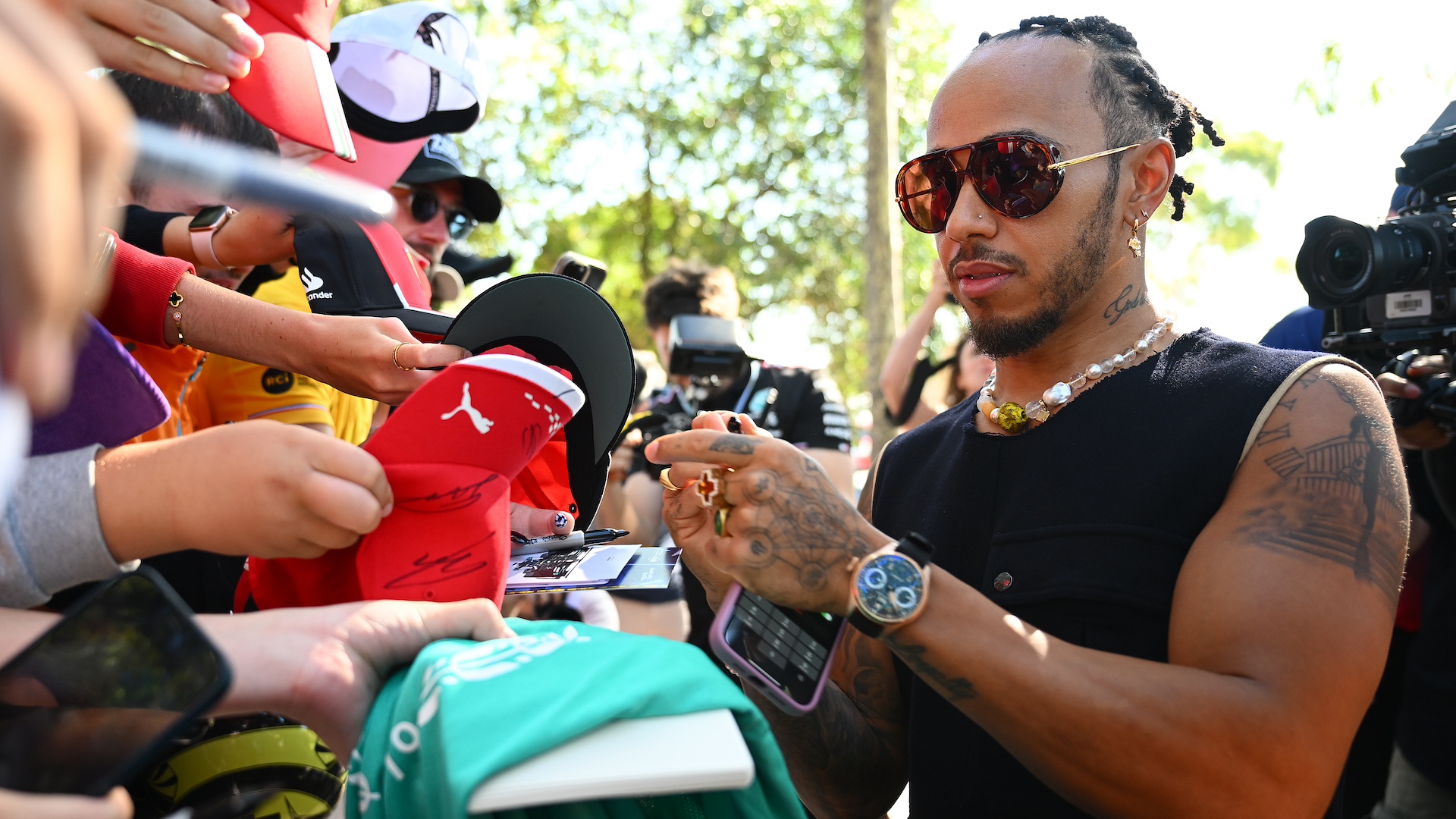 In a video shared by formula_aerodynamics on Instagram, Hamilton can be seen surrounded by fans at an appearance in Miami. As these things usually go, he’s being bombarded with requests, including some Ferrari caps, to which Hamilton quickly responds: “Mercedes caps, no Ferrari caps.”