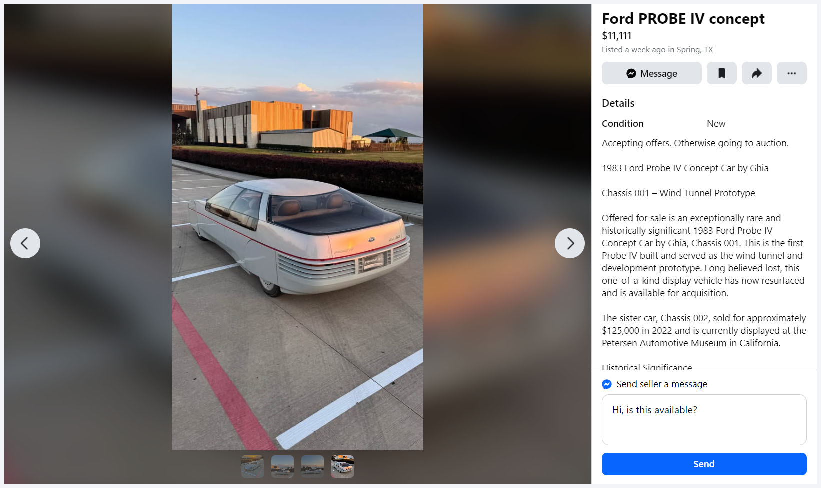 You find some pretty fascinating things on Facebook Marketplace. One that surfaced recently, via Ford Authority, was a Ford Probe IV concept car from 1983, reportedly one of two built. The other chassis currently resides at the Petersen Museum, but this one was rediscovered not long ago, per the listing, prompting the owner to take offers on it via Facebook without an asking price mentioned.