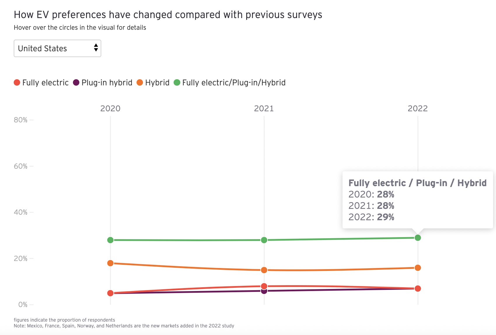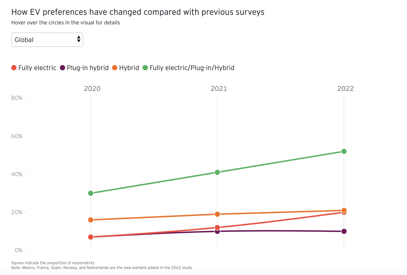 A survey published Monday of about 13,000 people from 18 countries conducted by EY found that, for the first time, more than half of respondents planning to get cars within the next 24 months want something electrified (a hybrid or electric vehicle), specifically 52 percent. That’s not an especially large sample, but year-over-year trends point to a larger theme. From 2021, interest has increased by 11 percent, and it’s climbed 22 percent from 2020. EVs have practically tripled in popularity over the same period, from a 7-percent rate of interest to 20 percent over the same period. However, those are worldwide figures; North American demand for electrified vehicles has remained relatively static. Even so, EY predicts EVs will become the bestselling form of automobile surprisingly soon—potentially by 2033.