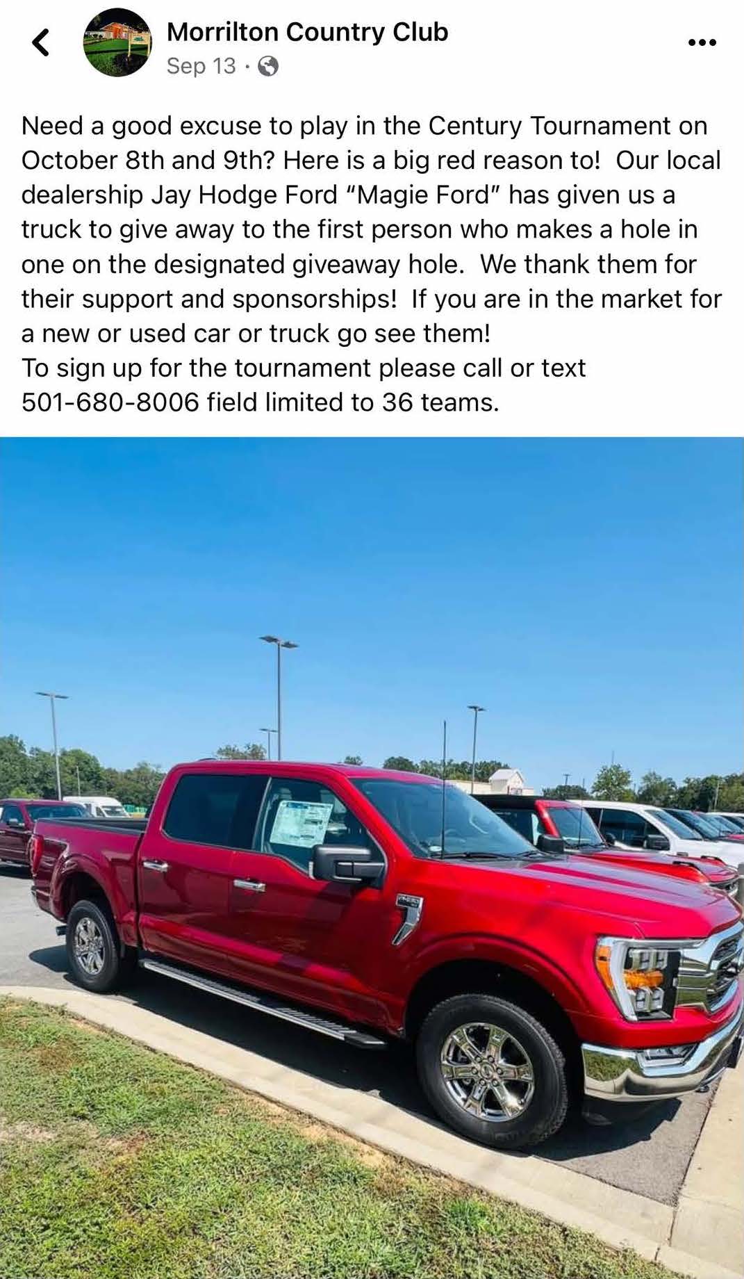 The truck was reportedly offered as a prize as part of a golf tournament Oct. 8 at Morrilton Country Club in Morrilton, Arkansas, according to The Kansas City Star. A screen capture of a Sept. 13 Facebook post from the country club shows the club stating that Jay Hodge Ford “has given us a truck to give away,” referring to a 2022 Ford F-150 crew cab 4×4 reportedly valued at $53,595. Another screen capture of a subsequent post on Oct. 7 promised that a “Hole in one on #10 gets you the keys to this F-150! Thanks to Jay Hodge Ford of Morrilton!” Jay Hodge Ford “liked” this post, which may be an endorsement.