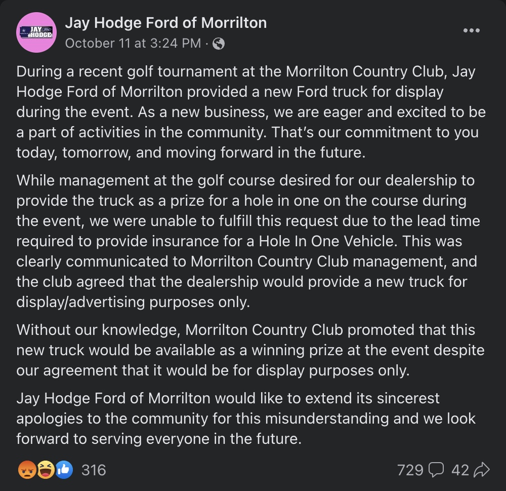 On Oct. 12, Jay Hodge Ford claimed on Facebook that it had only provided the truck “for display during the event,” and blamed “management at the golf course” for the implication that the truck could be won. It claims that the truck was offered as a prize “without our knowledge,” although the posts shown above may indicate otherwise.