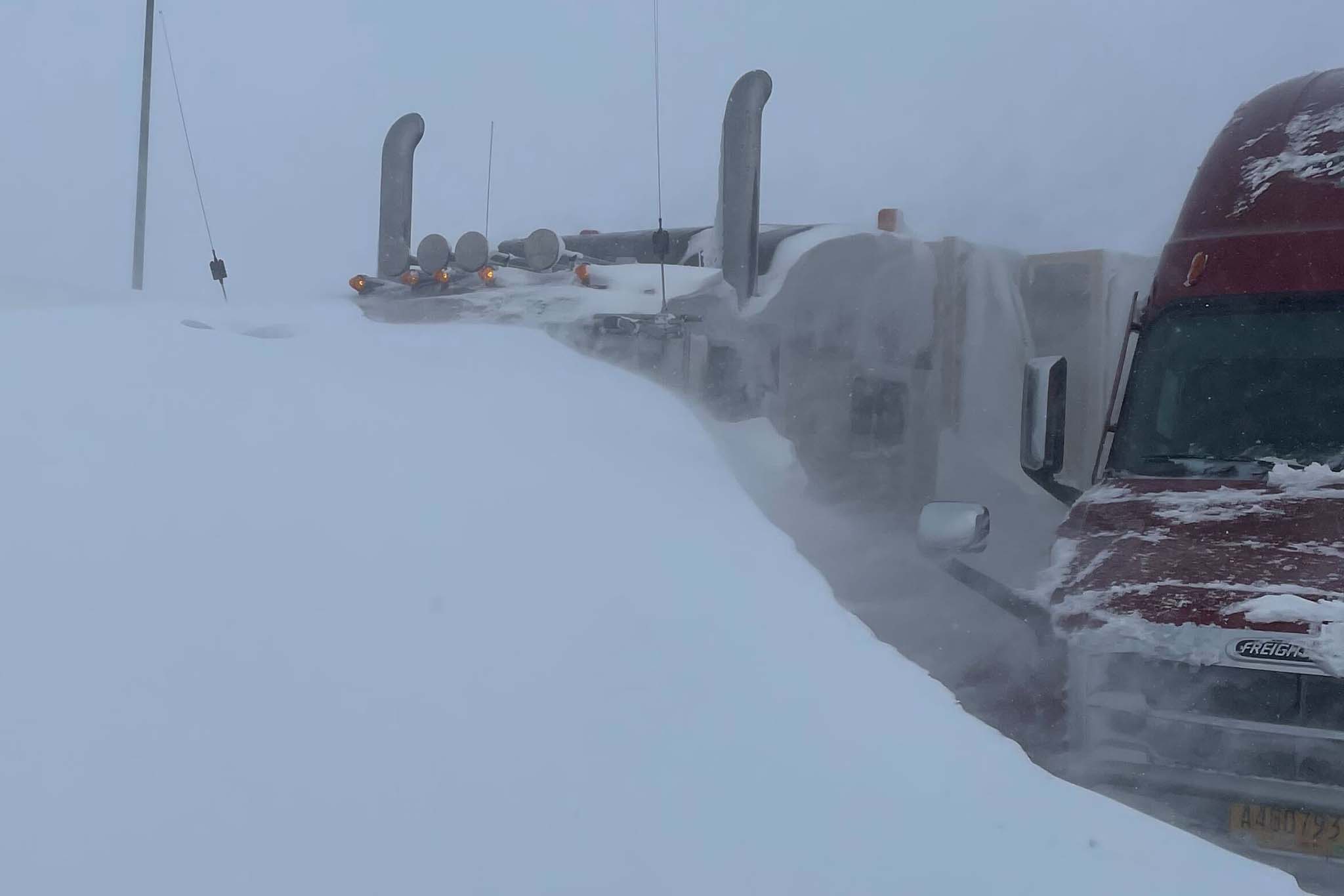 Conrad Quail tells me he was hauling an oversized load when he pulled into the Coffee Cup Fuel Stop around 10:30 a.m. local time Tuesday. They had blocked off Interstate 90, which led him and dozens more drivers to the gas station just off State Highway 83. He was finally able to leave around noon on Sunday, and he confirmed there were roughly 70-80 semis there with him.
