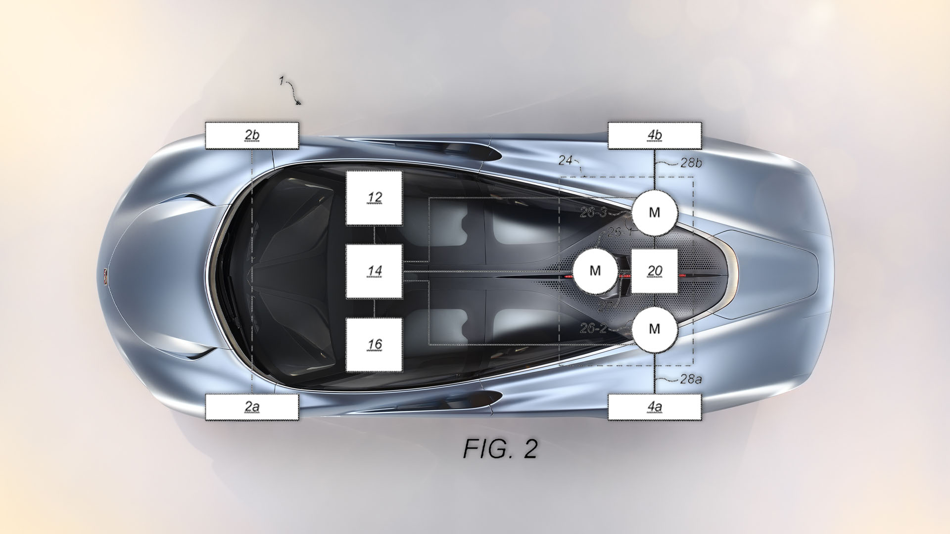 McLaren’s patent doesn’t specify the system’s total output. It also does not detail any individual motor’s output. The drive unit has stated applications beyond BEVs, though. The patent claims this system could be driven not just by a conventional battery pack, but also by a hydrogen fuel cell or a bank of supercapacitors. It also says this unit could be used in a hybrid vehicle, where it would be placed on the front axle with the rear axle driven by an internal combustion engine.