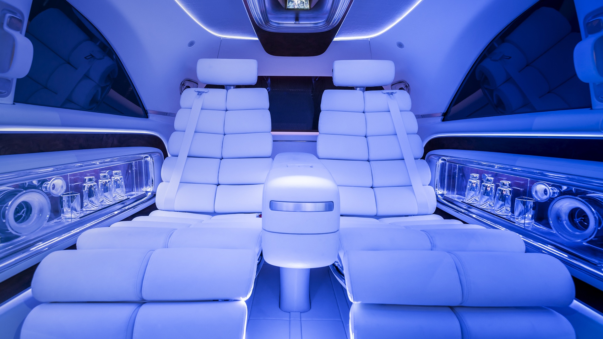 Several features lend credibility to the claim that the Vision V was developed as a modern version of classic Mercedes limousines, like the 600 Pullman. There’s a partition separating the driver’s area from the rear compartment, which the brand refers to as a Private Lounge, and it can be changed from transparent to opaque at the touch of a button. The side panels feature open-pore wood trim with LED accents, and the center console can be configured in several ways. In its most basic configuration, it’s an armrest with an integrated display cabinet. But, if you’re bored, it features a fold-out table that extends into a chessboard; The chess pieces are stored in a cabinet added to the driver’s side of the van. We wonder what kind of trick suspension you need to deliver a ride that’s smooth enough for an impromptu game of chess.