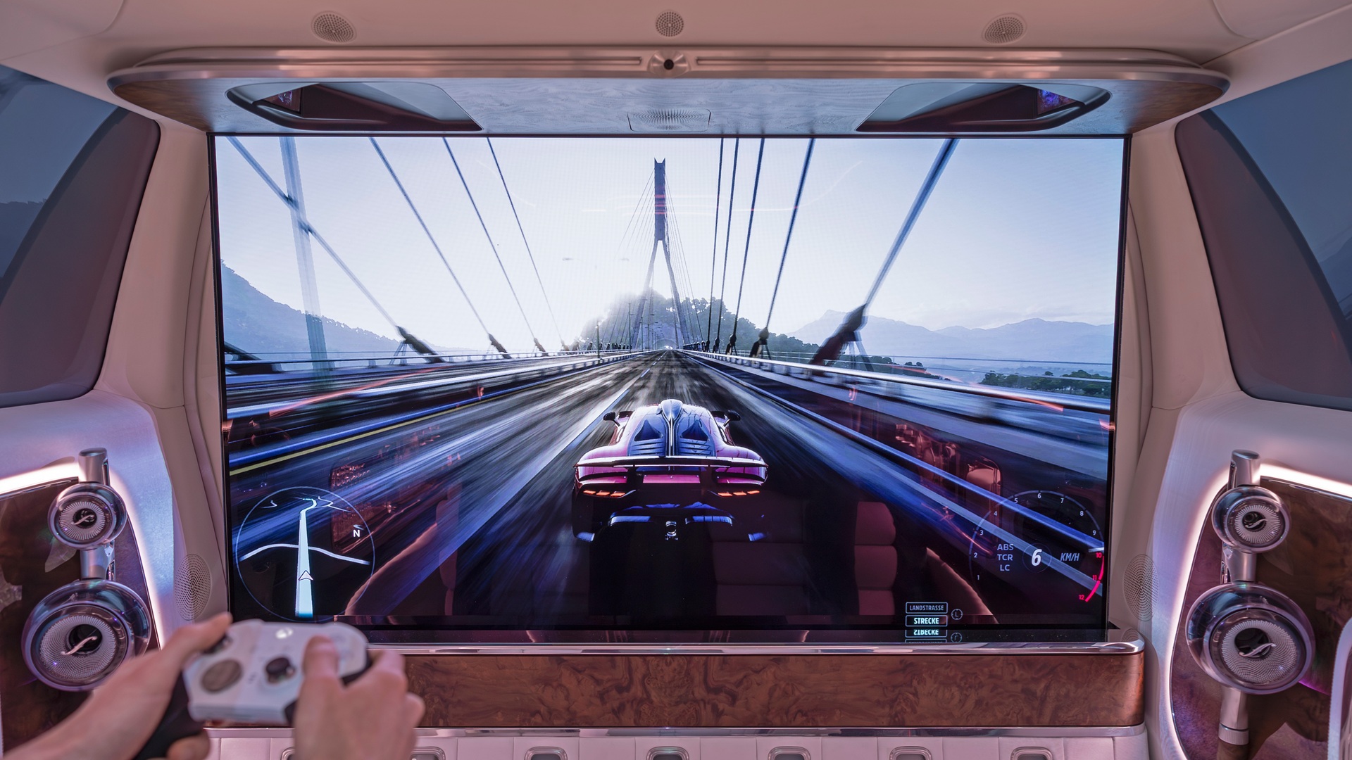 If you find chess too old-school, Mercedes has you covered. It added a retractable, 65-inch screen that boasts a 4K resolution. The display features a split-screen function, so the rear passengers can simultaneously watch and/or play different things, and it’s wired to a surround sound system with 42 speakers (!), including some that are embedded in the seats and that turn music into a haptic experience. It sounds like the final boss of rear-seat entertainment systems, but Mercedes notes the passengers can also use the screen to work or shop online.