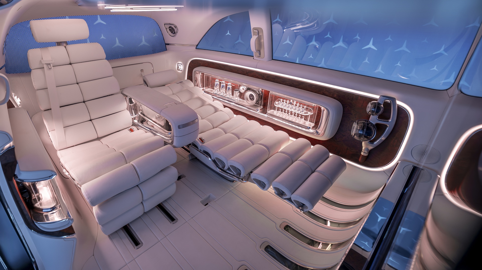 As you approach the Vision V, the wide sliding door automatically opens to reveal seats that kind of look like someone at Mercedes skinned the Michelin Man. We’re told that they’re inspired by the world of high-end lounge chairs and that the tubular cushions are highly flexible. The best seats in the house are out back: The rear passengers travel on individual, power-adjustable seats that can fully recline into a bed.