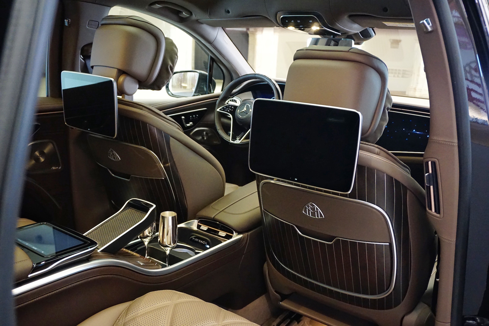 Like with a Rolls-Royce or Bentley, the real magic happens inside the cabin. Having previously spent time in the S580 Maybach I expected the interior to be the same, but I was wrong. While the overall design language translates, there is a completely new (and admittedly higher) level of craftsmanship and detail here. If this is Maybach’s new standard, then I’d say they’ve finally caught up to the fancier Brits. The waterfall-effect console that runs all the way from the backseat, through the front seats, and culminates at the infotainment screen is a work of art. Finished in matte wood and embossed with strips of aluminum, it serves as the focal point of the cabin.