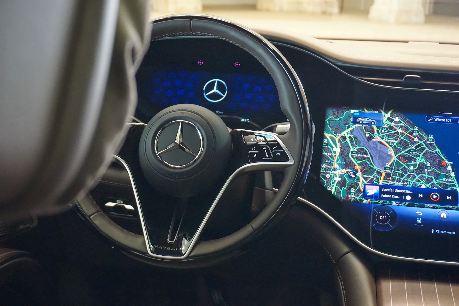 Folks who employ a chauffeur will be happy to know that the famous Maybach champagne chiller lives on in the electric era, and so do the accompanying silver flutes. The newly designed passthrough between the rear seats features a projection of the Maybach logo on the carpet, which is actually pretty neat. A detachable 9-inch tablet allows rear occupants to control all media, climate, and blinds, as well as some aspects of the seats. The rear chairs offer massage, can recline, and also boast retractable footrests to get comfy on long trips. Two 11.6-inch screens perched behind the front seats can display a variety of content for the rear passengers, though I gotta say that they’ve always been too complicated to operate, so perhaps stick to your iPhone and Netflix.