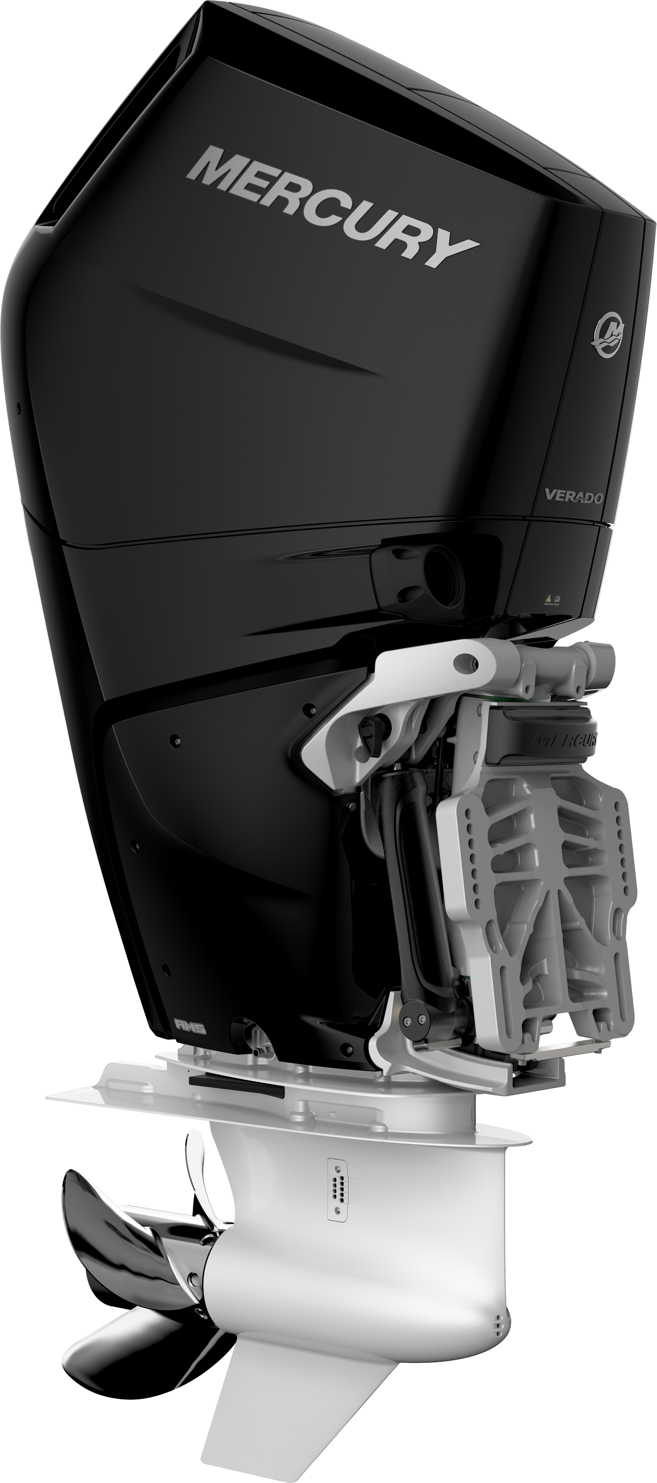The new Verado outboards are 5.7-liter naturally-aspirated V10 engines available in two trims, boasting 350 and 400 horsepower respectively. The engines were intended to deliver big power while offering lower noise, vibration, and harshness than the competition. Despite the new V10 configuration, they’re designed to work with industry-standard 26-inch mount spacings used by more typical V8 outboards. The full outboard has a dry weight of 695 lbs in either configuration.