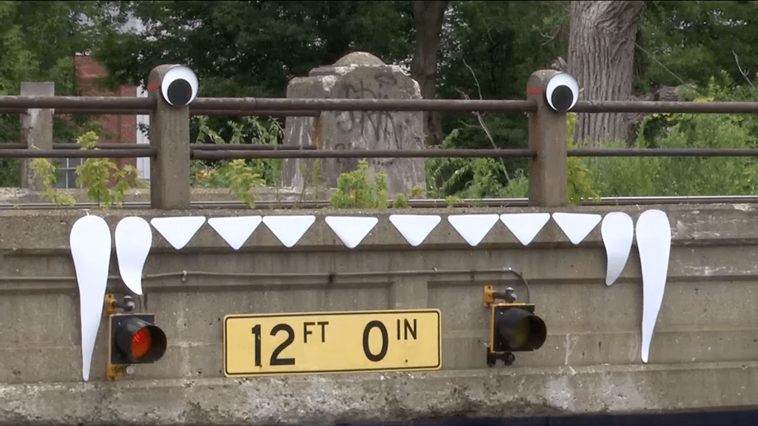 An anonymous artist and their partner have given Big Penny googly eyes and styrofoam teeth—sharp canines and all—partially as a warning to drivers, but mostly for a laugh, as WILX reports. The artists seem to have joined in on the City of Lansing’s collective joke, whose punchline has been dozens of truck trailers and RVs that have had their roofs sheared off or otherwise destroyed while trying to clear the low bridge. And what could be more fitting for a truck-eating bridge than a pair of goofy eyes and big fangs?