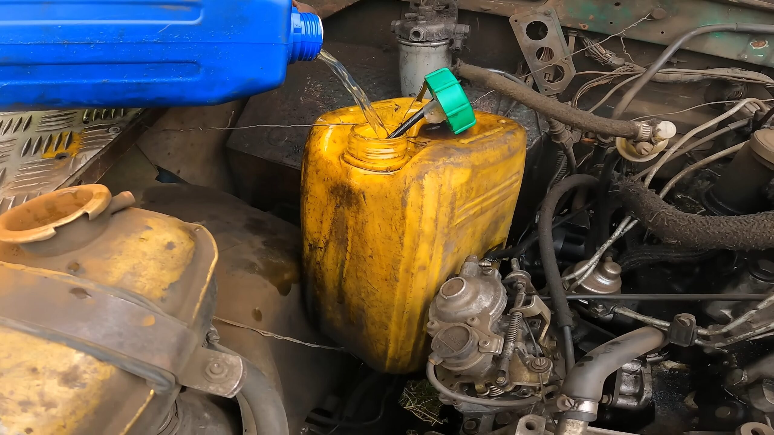As a bonus, we get to see the refueling process for this janky four-wheeler. In place of a proper fuel tank, there’s just a yellow jug that lives in the engine bay with a pickup hose dangling inside. It’s topped up with fresh diesel from a jerry can while the engine clatters along just inches away.
