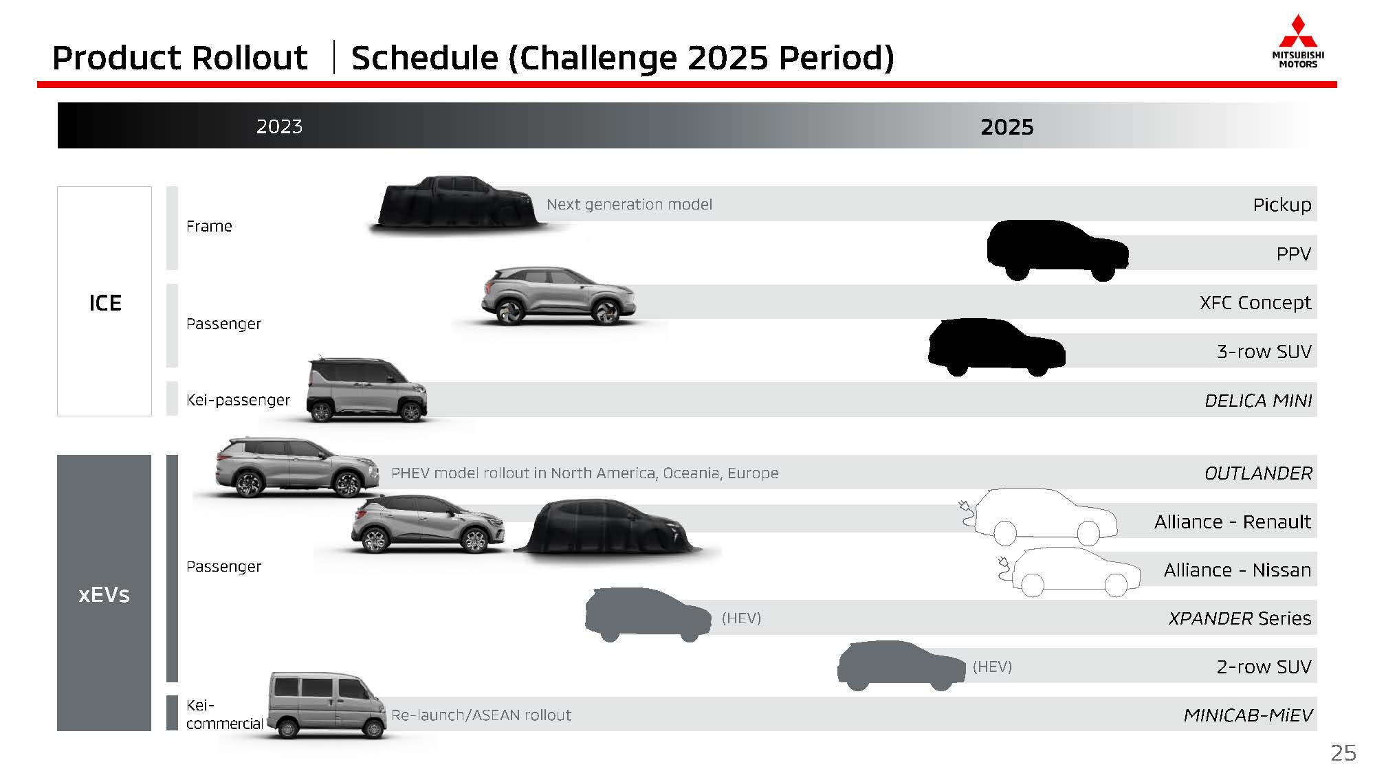 By that point, Mitsubishi expects EVs to account for half its global sales, though it doesn’t forecast full electrification until 2035. That means ICE will still play a central role in Mitsubishi’s product plans for the next five years, which will see it launch 16 products globally, nine of them electrified in one way or another.