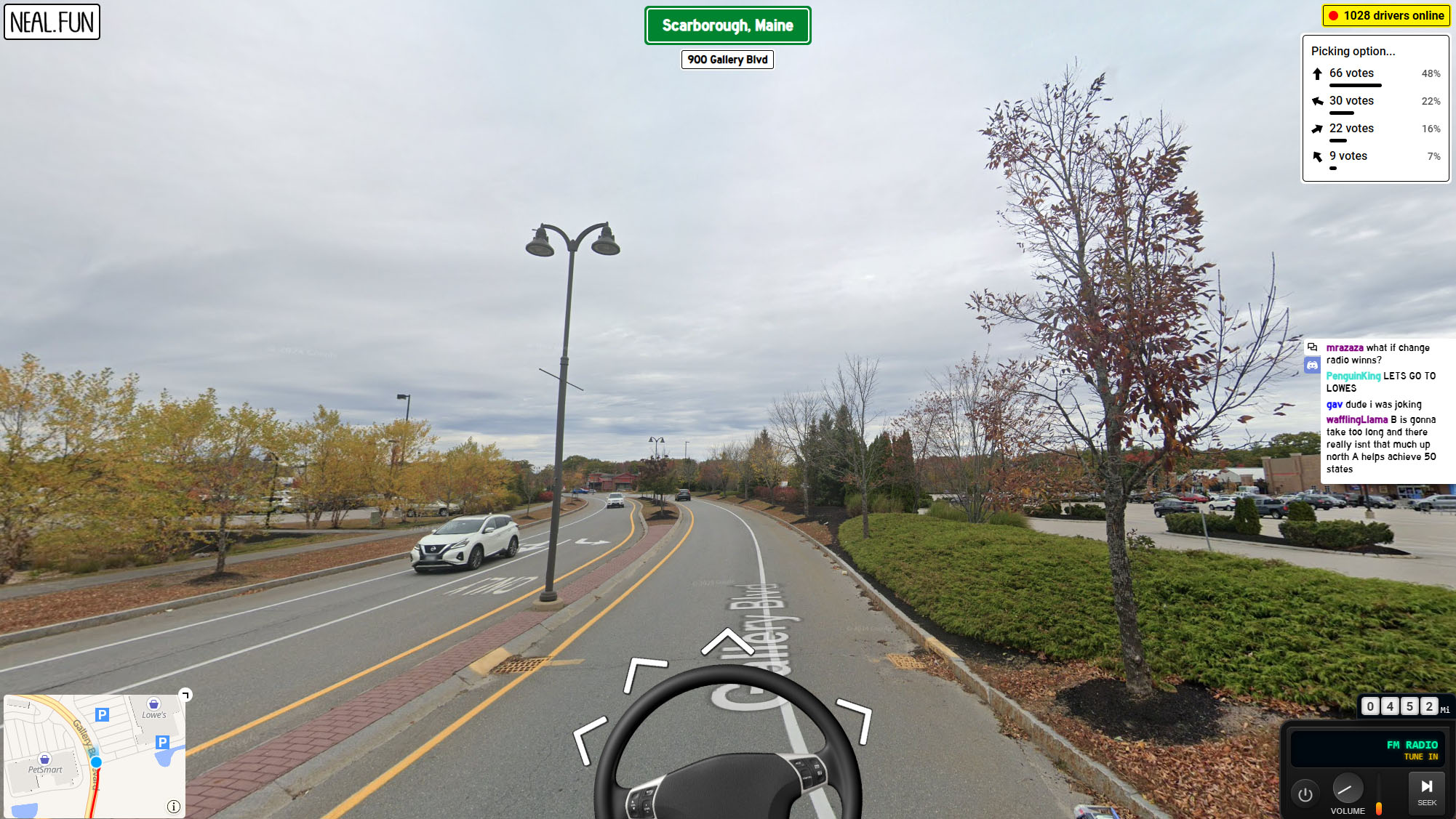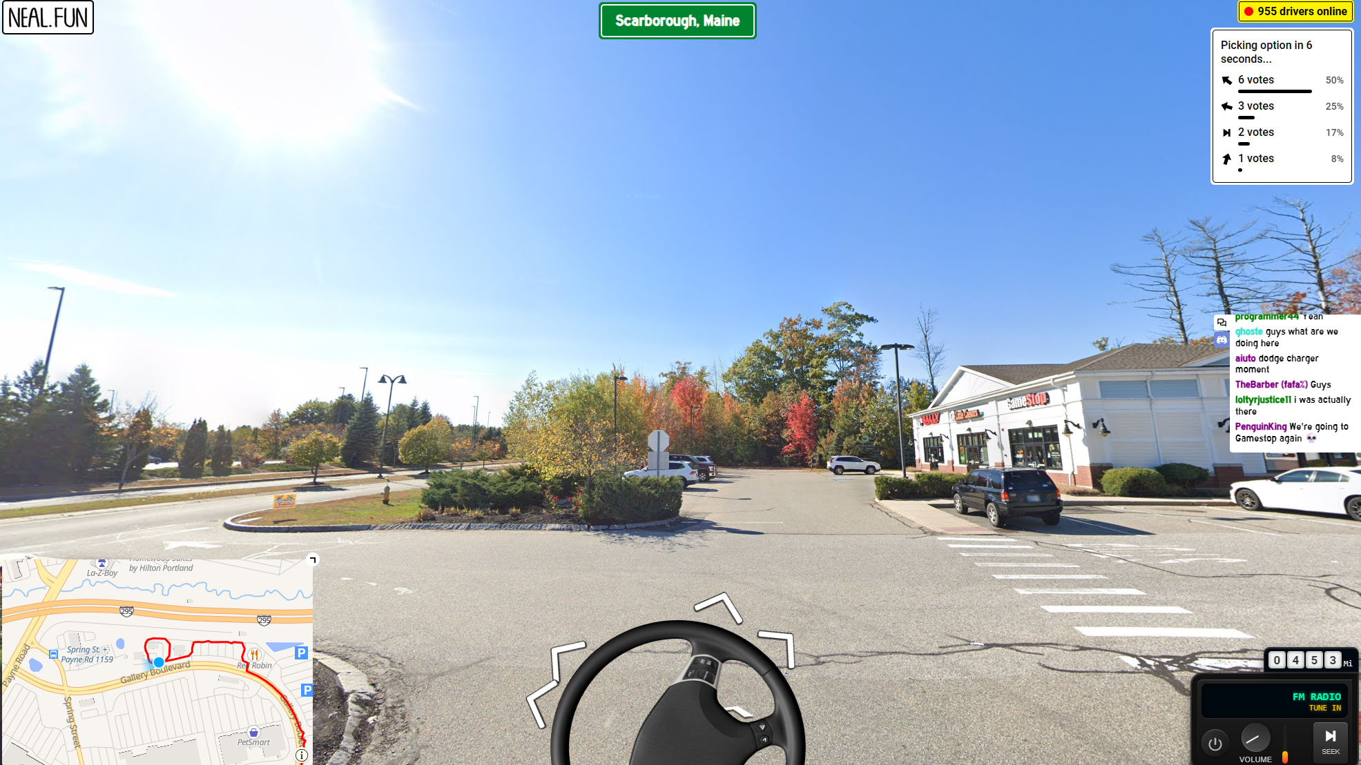 The interface is refreshingly simple. Most of the screen is taken up by images collected from Google Maps, a small steering wheel that moves, and arrows that indicate where the car can go. The column on the right side of the screen provides real-time details such as how many drivers are online, the number of votes that each option is getting (sounding the horn is surprisingly unpopular), and the number of miles driven since the beginning of the road trip (about 450 as of writing). There’s also a live chat which reminds me of the chat rooms that were popular in the 2000s, both in terms of the design and in terms of the random shit people digitally blurt out, and a radio at the bottom.
