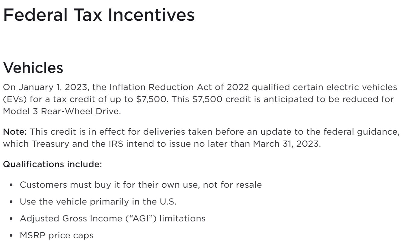 “On January 1, 2023, the Inflation Reduction Act of 2022 qualified certain electric vehicles (EVs) for a tax credit of up to $7,500,” writes Tesla on its website. “This $7,500 credit is anticipated to be reduced for Model 3 Rear-Wheel Drive.”