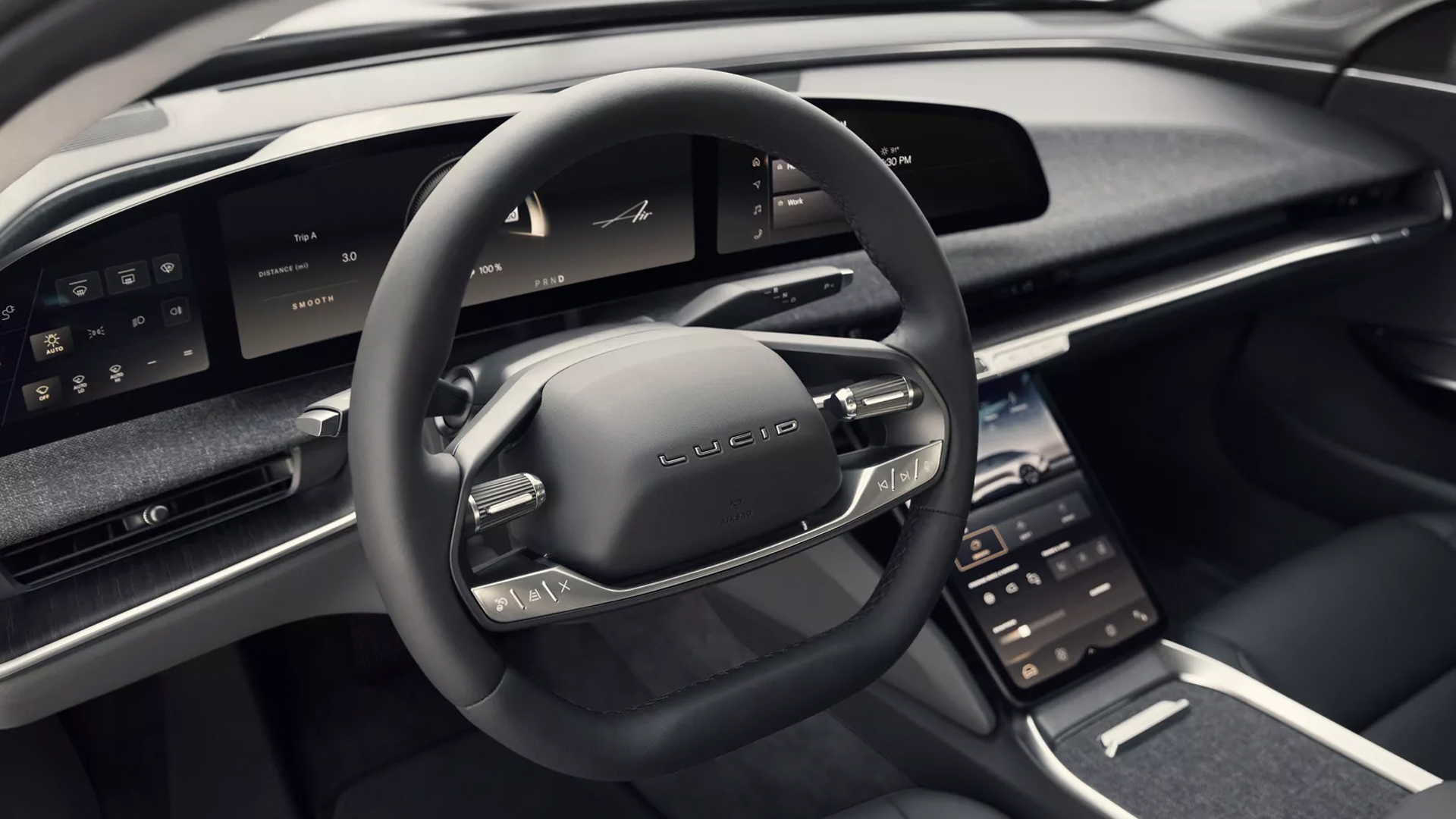Two standard no-cost colors are available—white and black—and the only no-cost interior option is a black leather alternative. It also only comes with an aluminum roof as-standard, and there isn’t a glass roof option. You still get 12-way power front seats, which are heated, as well as a heated steering wheel, Lucid’s infotainment system, Apple CarPlay, and LED headlights included in the base price.