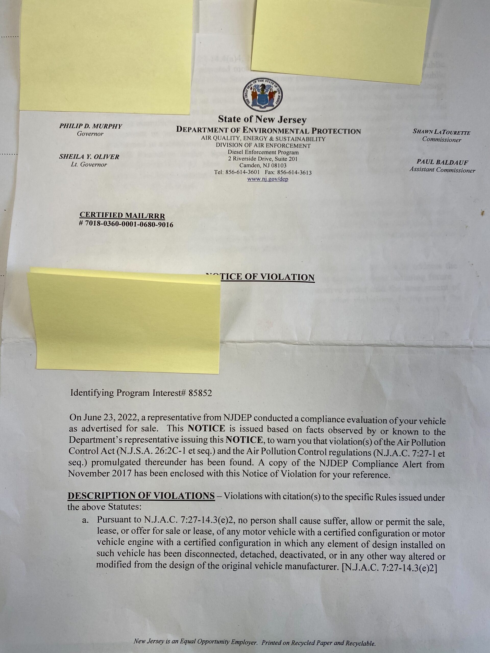 That was enough to catch the attention of the New Jersey Department of Environmental Protection. Without having seen the vehicle in person, the organization mailed a notice to Sebold explaining that his truck was out of compliance according to state law. The letter, which was viewed by The Drive and is embedded below, listed exact violations including the attempt to sell a vehicle whose emissions equipment had been tampered with.