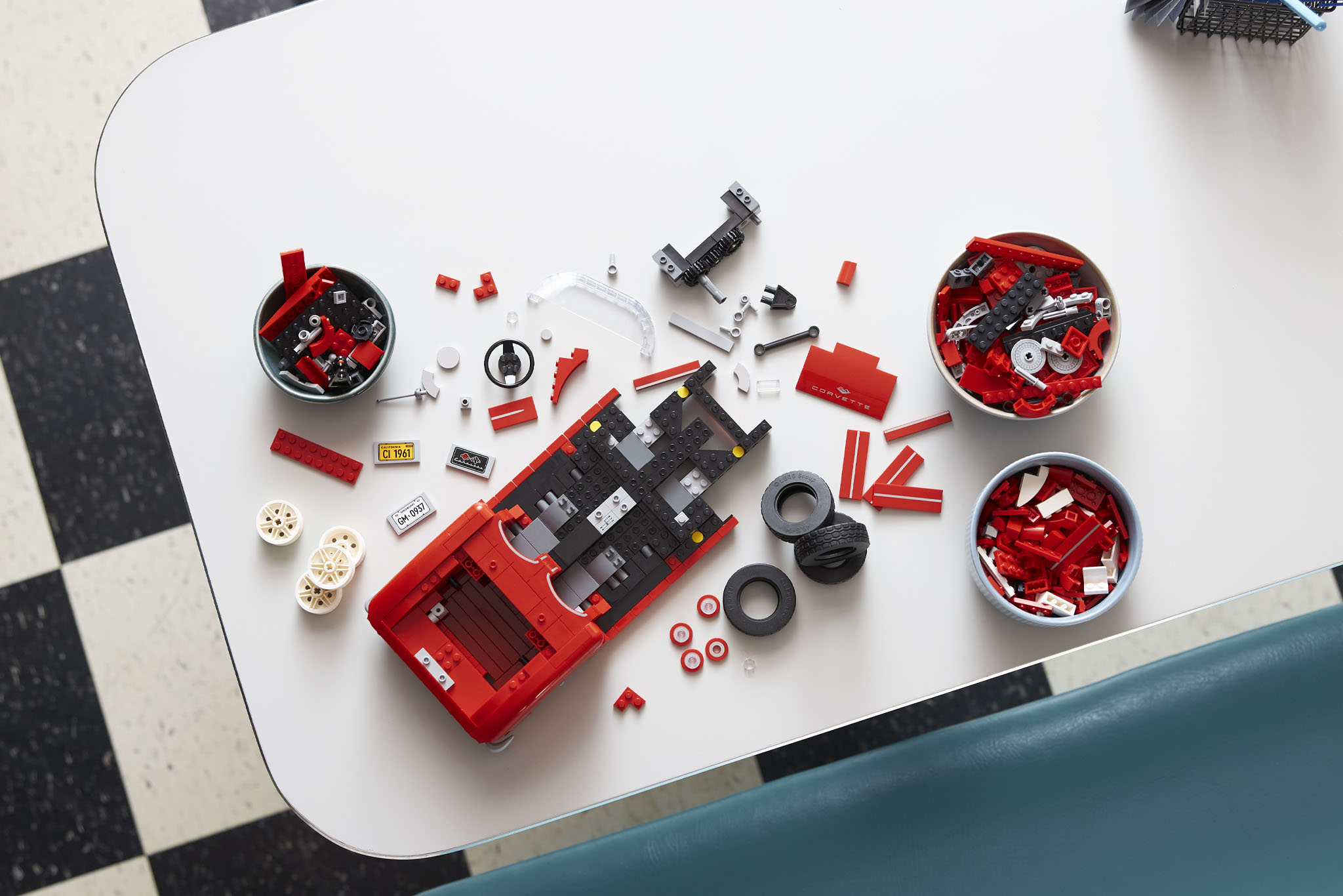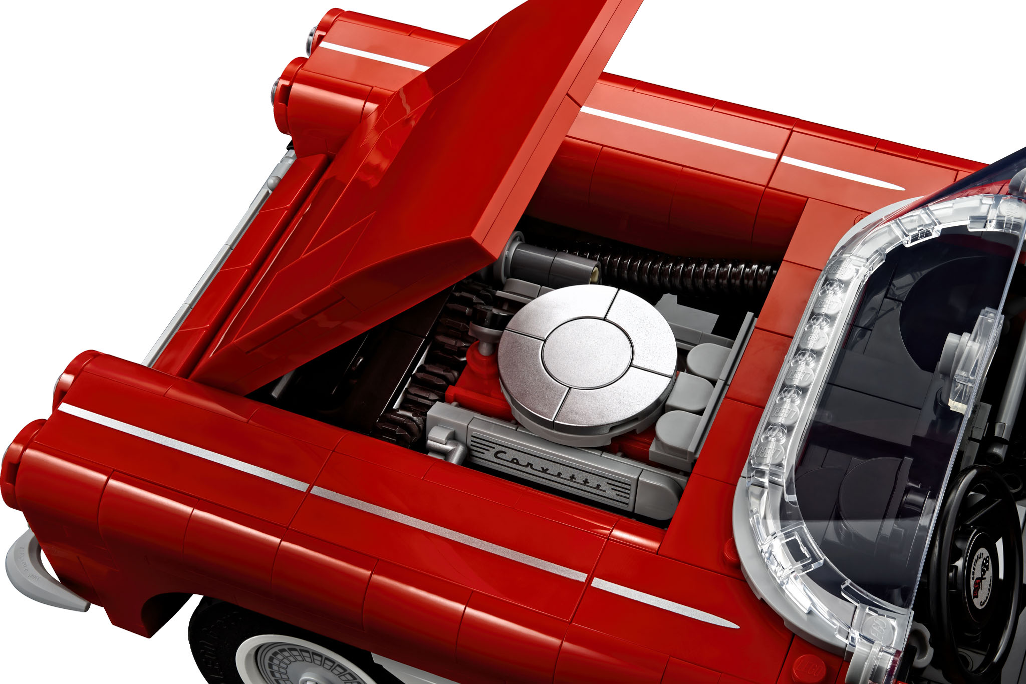The included hardtop hints at some of the kit’s functionality. It has working steering, opening hood and trunk, as well as a teeny tiny small-block V8 to complete the picture. The radiator fan even spins, for those hot days in Lego traffic.