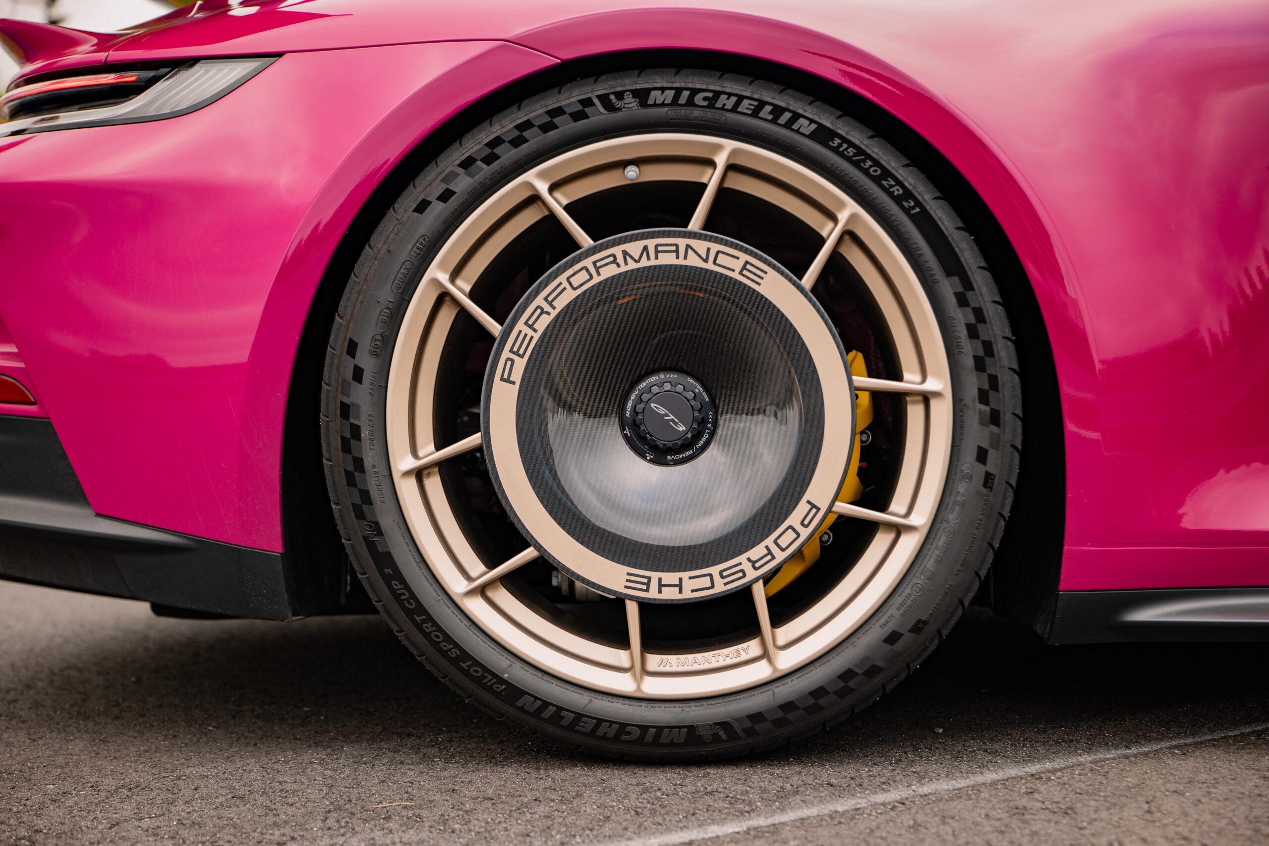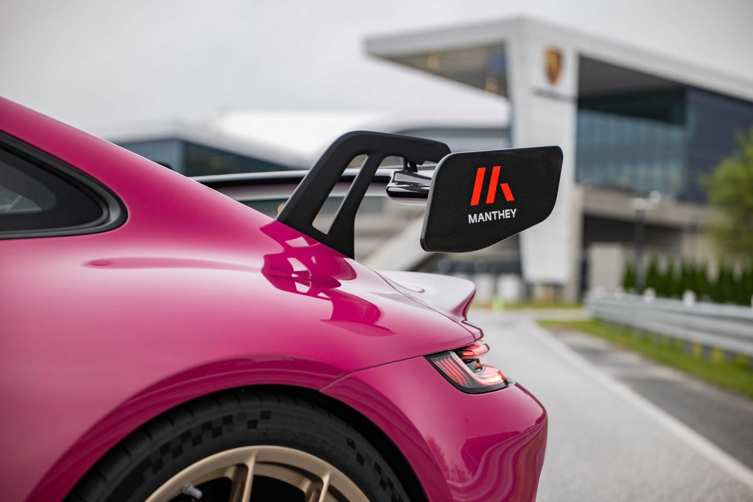 At the rear, the swan-neck factory wing element is replaced with a larger swan-neck wing with a gurney flap, adjustable angle of attack to fine-tune high-speed handling balance, and larger end plates to reduce drag. The fins of the rear diffuser are extended and made of carbon fiber. Finally, the distinctive Manthey aerodiscs installed on the rear wheels reduce drag.