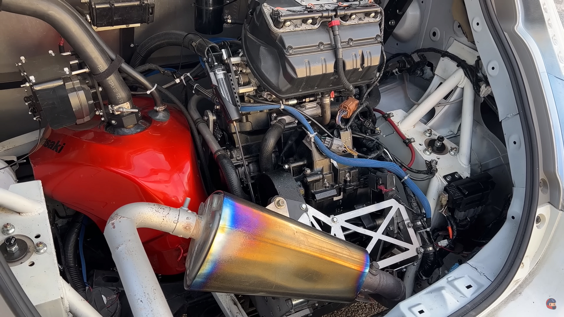 The coolest car you’ll read about today is a Nissan Leaf. Yeah, really. Sure, it’s a mighty fine car for tooling around town, but it’s pretty tough to make the Leaf sound or look cool. That is unless you’re a mechanical engineer who had the idea to stuff a Kawasaki motorcycle engine into the trunk of a Leaf and actually went through with it. The result is a Nissan Leaf hybrid with an engine that screams to 13,000 rpm.