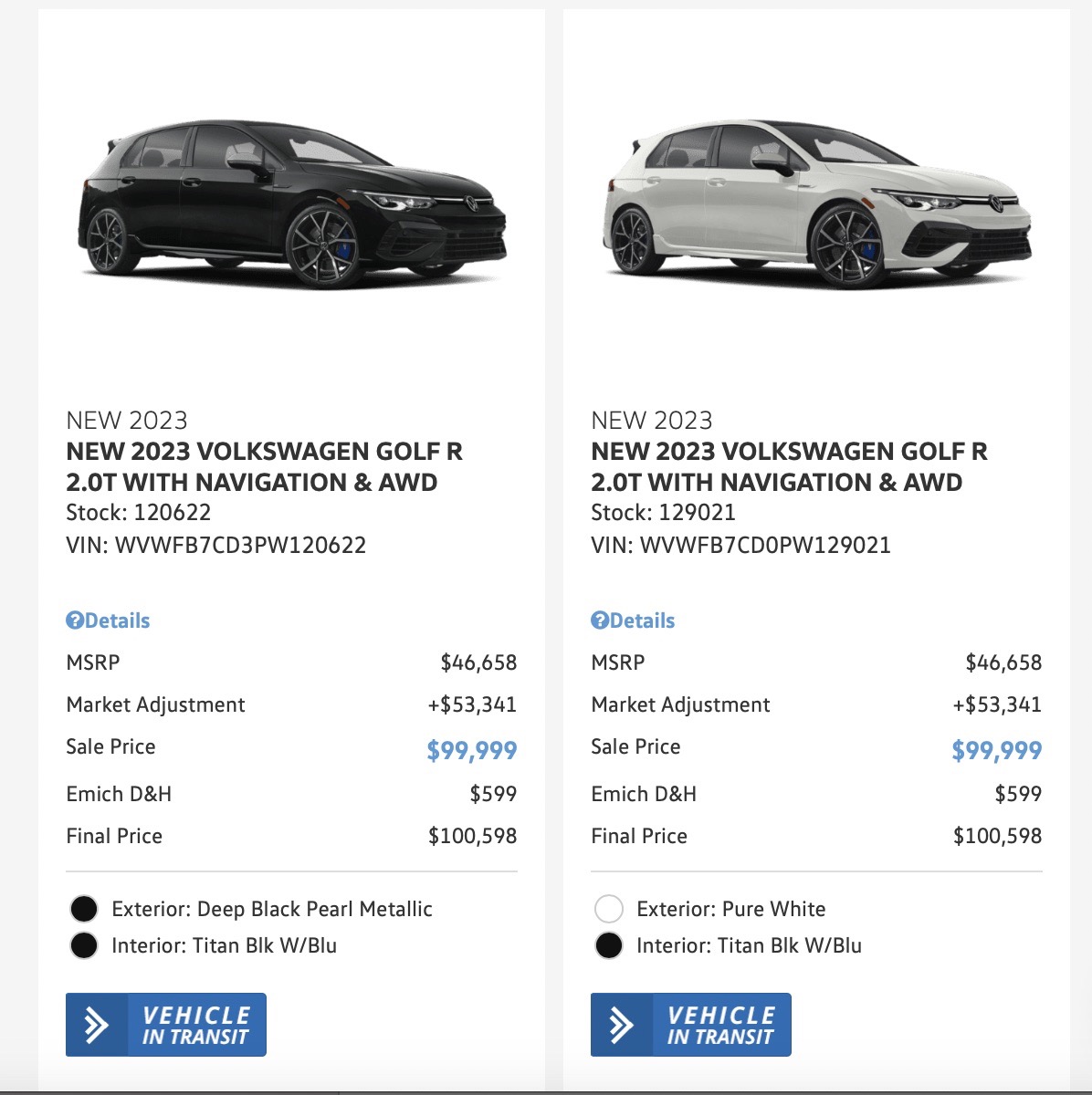A viral Reddit post and flurry of tweets Tuesday have VW fans and car buyers alike wondering aloud: Who’s paying $100,000 for these new 2023 VW Golf Rs? The answer: No one.