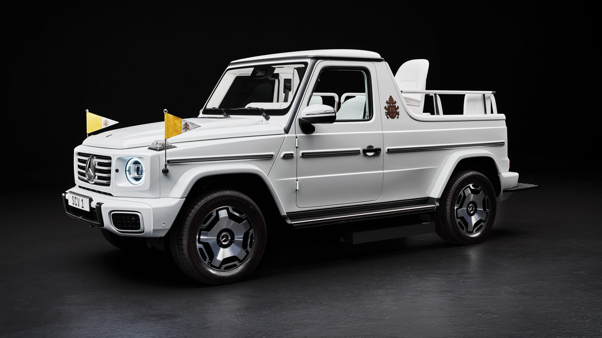 Visually, this new Popemobile looks like the old G-Class Cabriolet, so it isn’t exactly pretty. But, then again, it isn’t meant to be. That pickup truck-style bed behind the B-pillar isn’t for hauling, though. Instead, it has a massive swiveling seat where Pope Francis will ride. Behind him are two small jump seats, likely for members of the Swiss Guard to sit. It also comes with a separate hardtop roof that can be put in place if it’s raining.