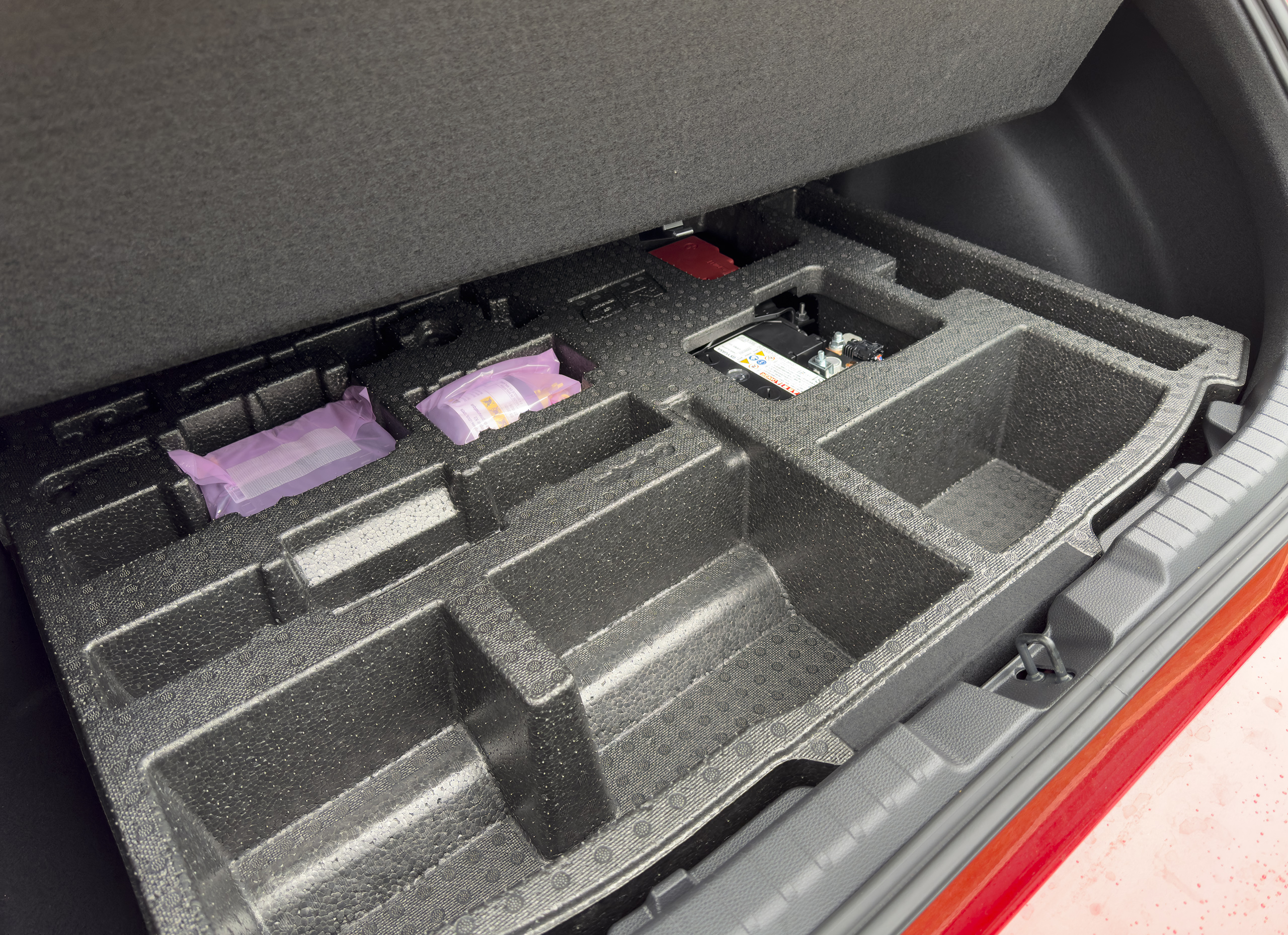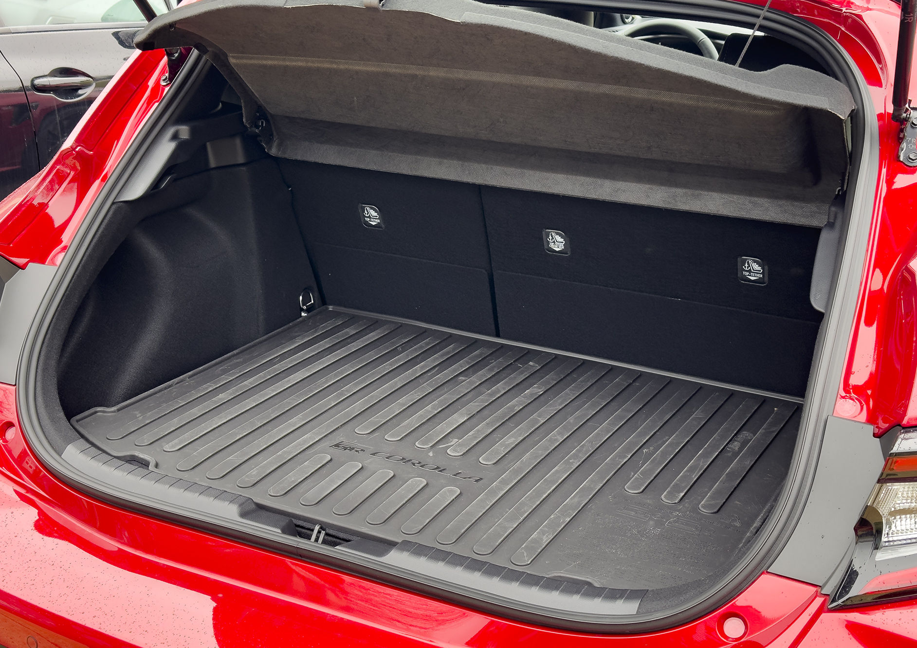 See, Toyota relocated the Corolla’s battery to the trunk for the GR version, for weight distribution reasons. That’s cool, sure, but it kind of stops being cool when you learn that this was achieved by mounting the battery where the load floor would typically be, and raising the entire floor up above it. While I appreciate the foam cubbies so thoughtfully provided to make the surrounding space a bit more usable (gee, thanks for that tube of Fix-a-Flat), I’d rather the battery take a rectangular bite out of the trunk space, like an old subwoofer or something, because verticality truly comes at a premium here.