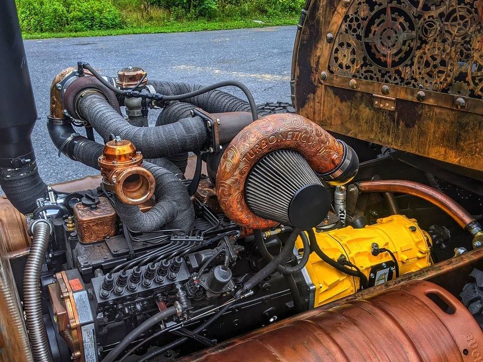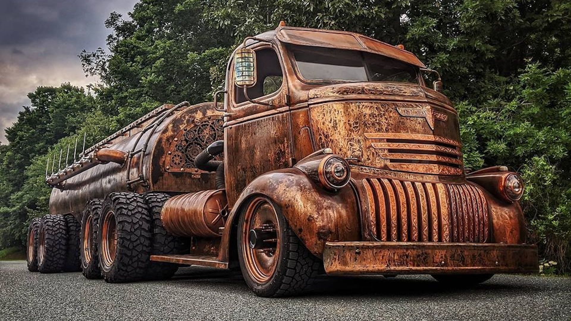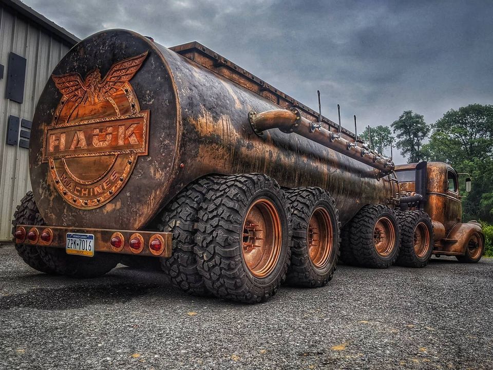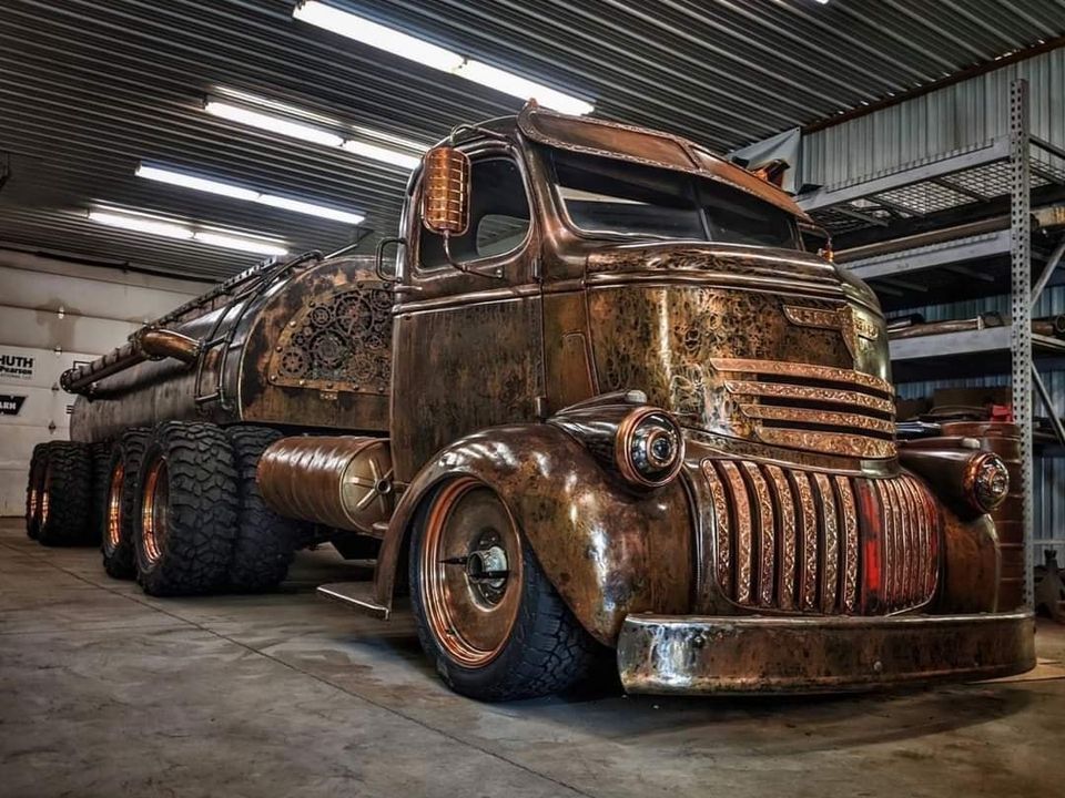 This tanker is based on a Chevy AK-series cab-over-engine truck, which was built from 1941 to 1947. Contrary to its name, its engine is located behind its cab, taking the form of a Cummins 12-valve. That’s the colloquial name for the 6BT, the 5.9-liter turbodiesel straight-six used in late-’80s and ’90s Dodge Rams. How much power it makes is beside the point, as a rat rod is all about looks, and the Cummins goes uncovered so light can glint off—and this is the most baller thing I’ve typed in a long time—its copper-plated, hand-engraved turbocharger.