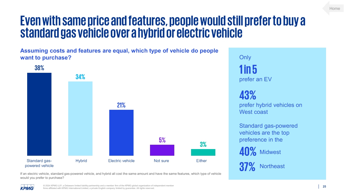 If anything, the KPMG study highlighted the disconnect between shoppers and sellers. The EV and hybrid preference, of course, is West Coast-heavy. In the Midwest and Northeast, standard gas-only cars were the top choice for 40 and 37 percent, respectively.