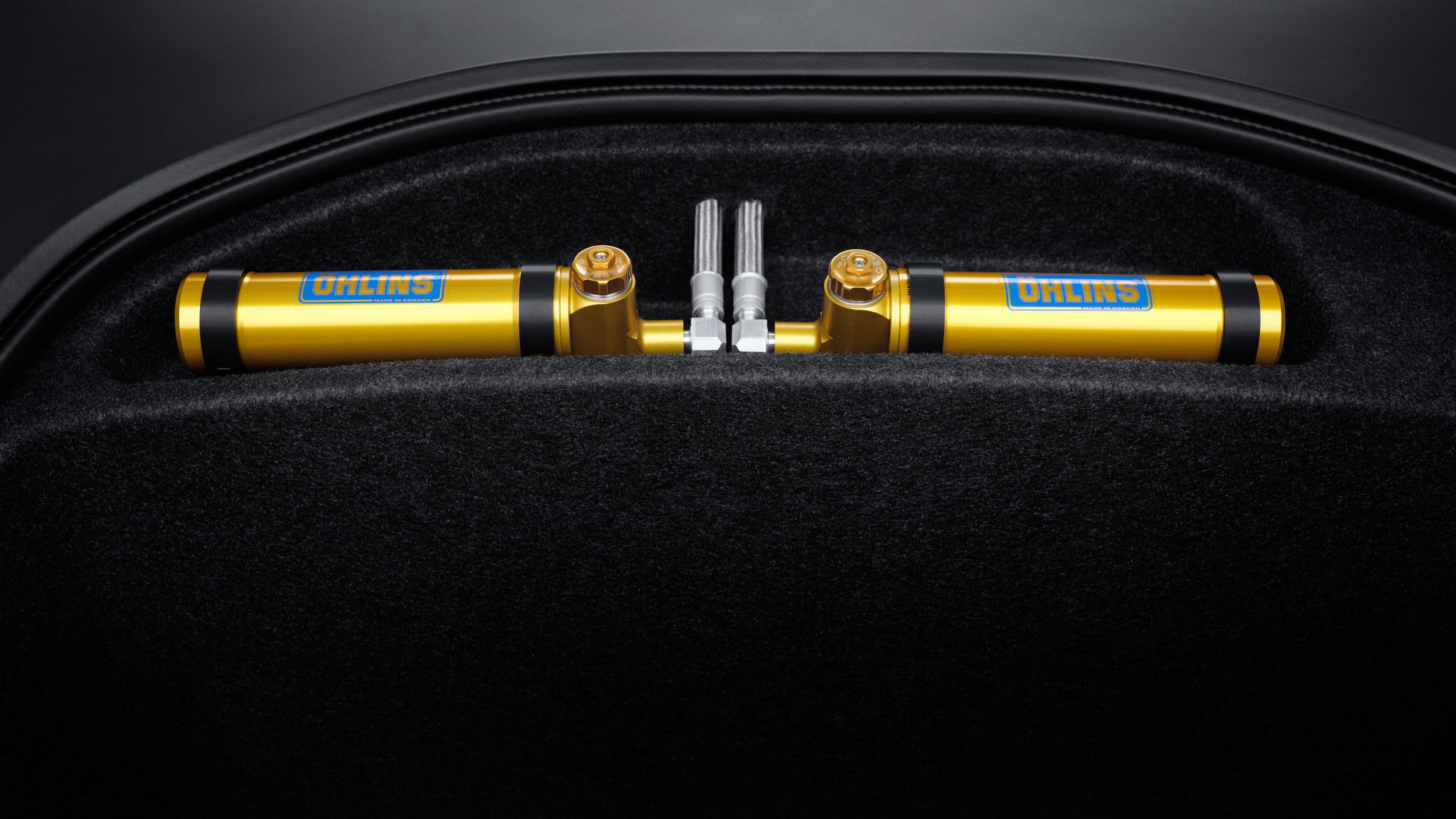 Ride height has been lowered by 25 mm (~1 inch), providing a more aggressive stance and improved handling. Special Öhlins racing-spec adjustable dampers have also been fitted, complete with auxiliary reservoirs under the hood for easy adjustment. There’s also a new front strut bar intended to improve feedback through the steering, while the springs are 20% stiffer for a sportier ride.