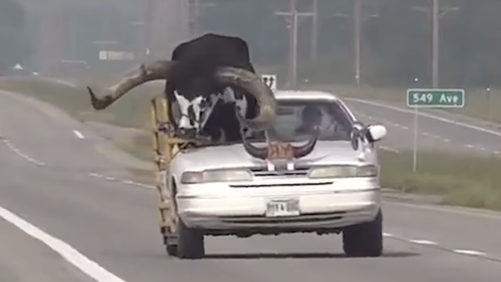 The traffic stop occurred around 10 a.m. Wednesday according to 1011 Now, with Norfolk Police intercepting the Ford on U.S. Route 275 eastbound in Nebraska. They found a 1992-1997 Crown Victoria with much of its right side cut away to fit a mature Ankola-Watusi bull, a rare breed of African cattle known for its large horns. Bulls average around 1,300 pounds fully grown but have been known to exceed 1,600 pounds. This particular specimen’s weight isn’t known, but his name is: Howdy Doody. And how’d he ever doodie all over the Ford’s roof.