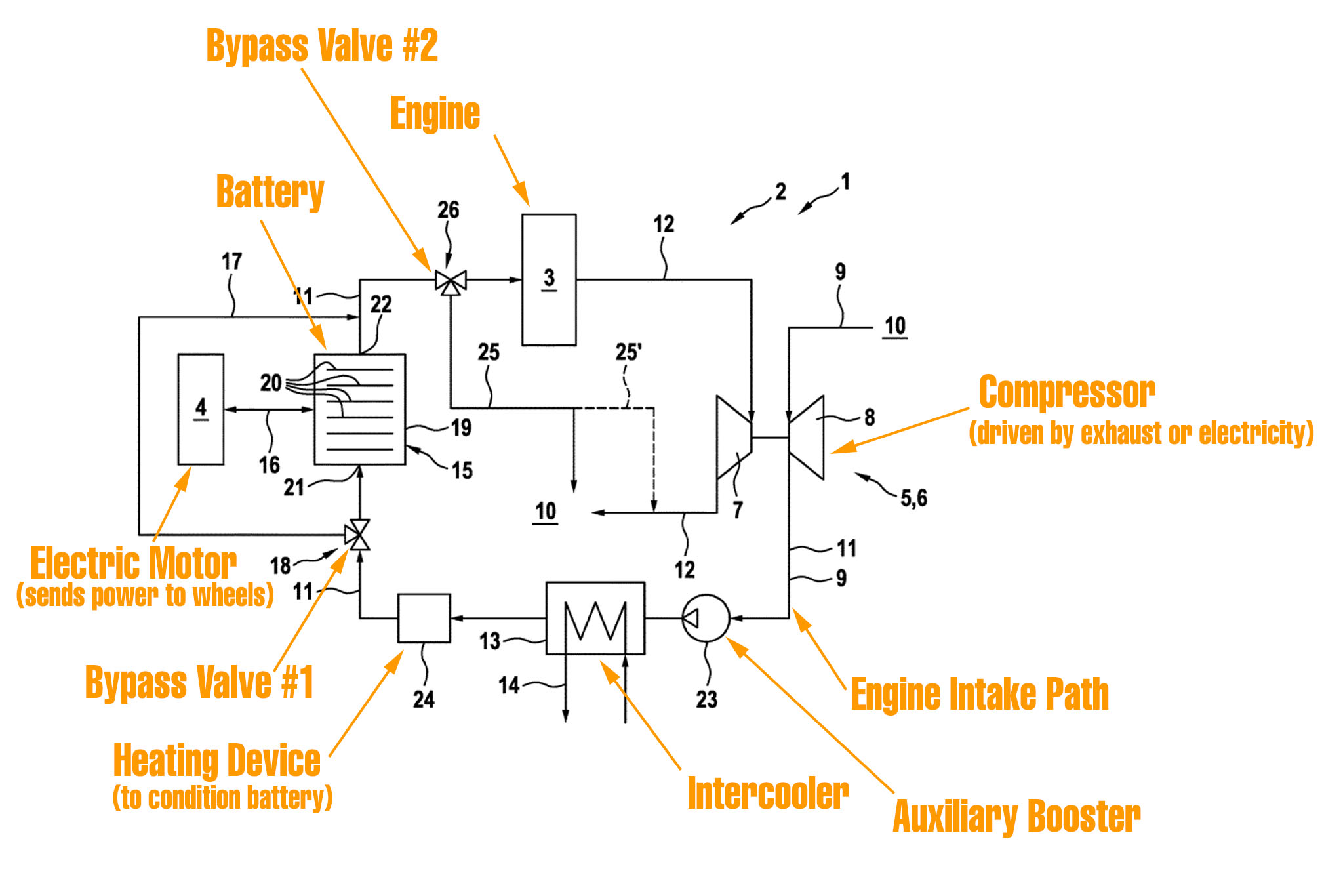 The outside air is first compressed, either by a conventional turbocharger or an electric supercharger. It then encounters an auxiliary booster. This is described as a “blower, pump, compressor or the like,” and it’s there, as I understand it, to provide cooling air for the battery at low engine speeds if the system utilizes a conventional turbocharger. In other words, if the battery is still hot but there’s not enough airflow from the turbo to cool it, it kicks on to provide some more airflow. If the system uses an electric compressor instead of a regular turbo, this may not be included.